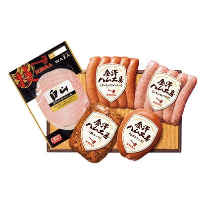 ●商品内容/ホワイトロースハム60g、焼ローフ230g、レモン&パセリウインナー・ガーリックウインナー 各105g、U字フランク160g