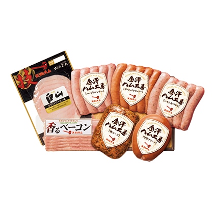 ●商品内容/ホワイトロースハム60g、香るベーコン90g、焼ローフ230g、レモン&パセリウインナー・ハーブウインナー・ガーリックウインナー 各105g、U字フランク160g