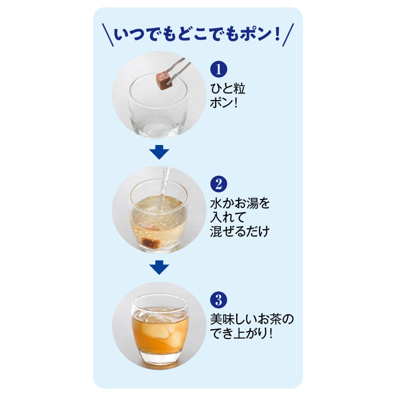 「ポン!」といれて「ちゃ」ちゃっとすぐできる。かんたん便利。ティーバッグや茶葉の出がらしのゴミも出ない、軽くおしゃれなフリーズドライティー。お湯でも水でも溶けます。【商品提供者コメント】