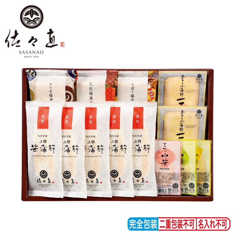 ●商品内容/笹かまぼこ吉次5枚、仙台小笹(しそ・チーズ・ホタテ 各1枚)、揚蒲鉾(五目・さつま・ごぼう 各1枚)、おとうふ蒲鉾ミニ一丁2枚