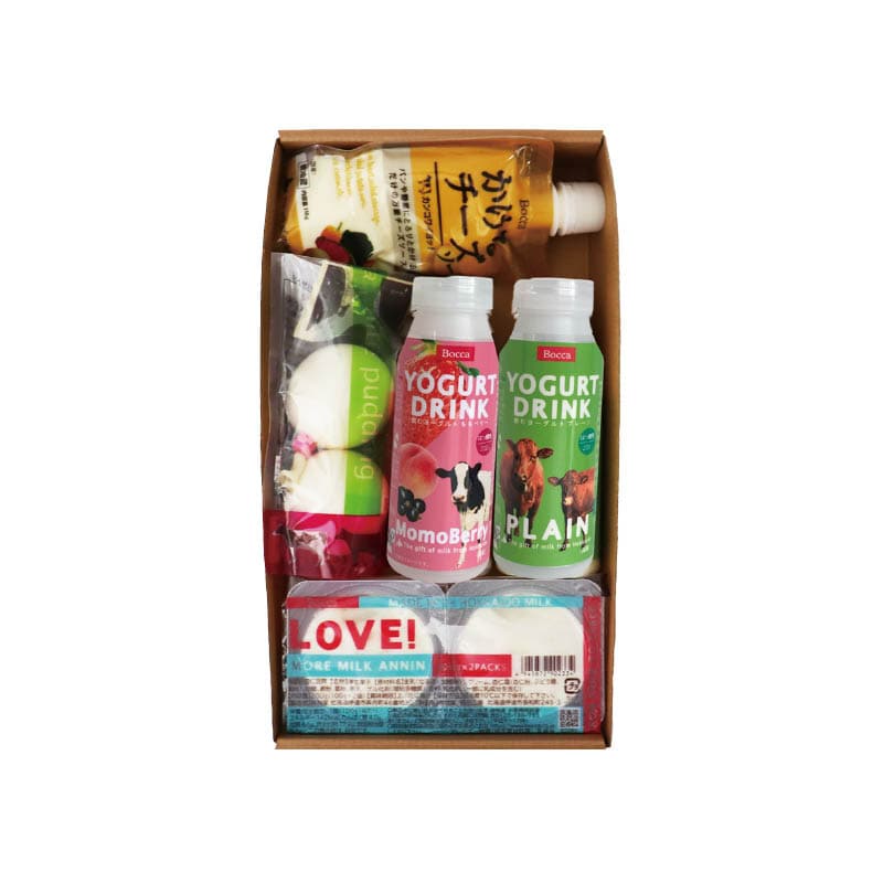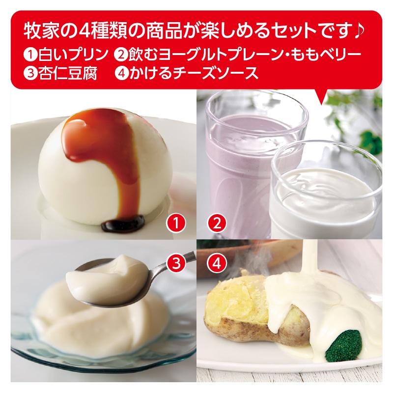 ●商品内容/白いプリン(プリン75g・ソース5g 各2)、飲むヨーグルト(プレーン・ももベリー 各200g)、杏仁豆腐100g×2、かけるチーズソース110g