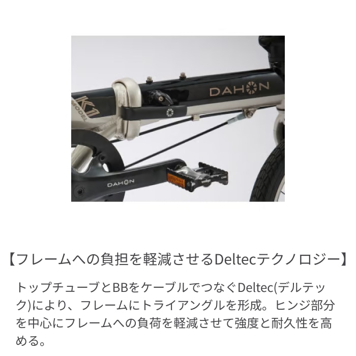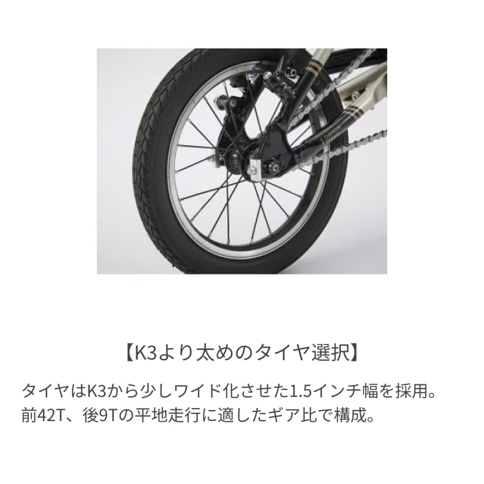 コンパクトフォールディングバイクの理想形を追求する「Kシリーズ」から、よりシンプルに、よりタウンユースな使用を想定した14インチの最新モデルとして新登場です。超コンパクトで軽量なサイズ感は「K3」と同じく、安定感を増すためにやや太めのタイヤ幅を選択。シングルスピードのギア比は都市部の平地を走るにはベストな歯数を採用しています。シングルスピードはチェーントラブルにも強いためデイリーユースはもちろん、旅行先でのちょっとしたサイクリングにも安心です。