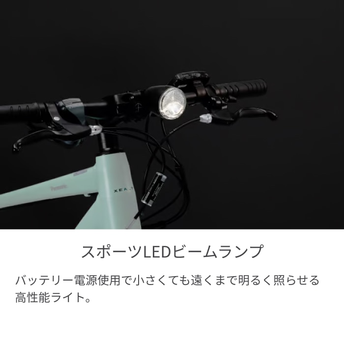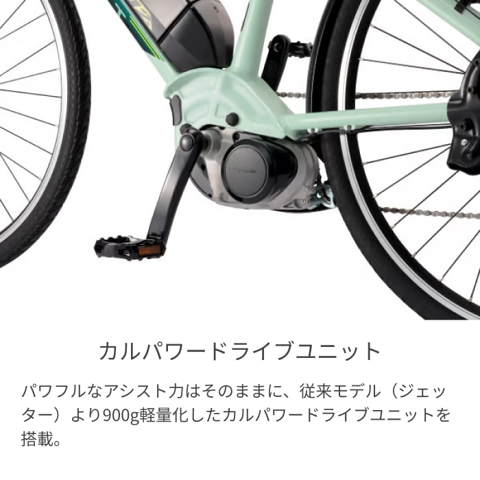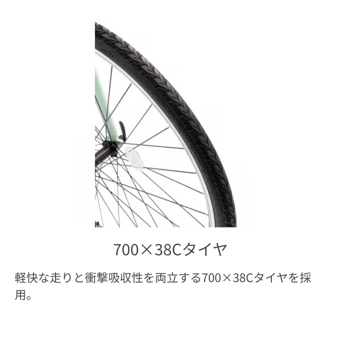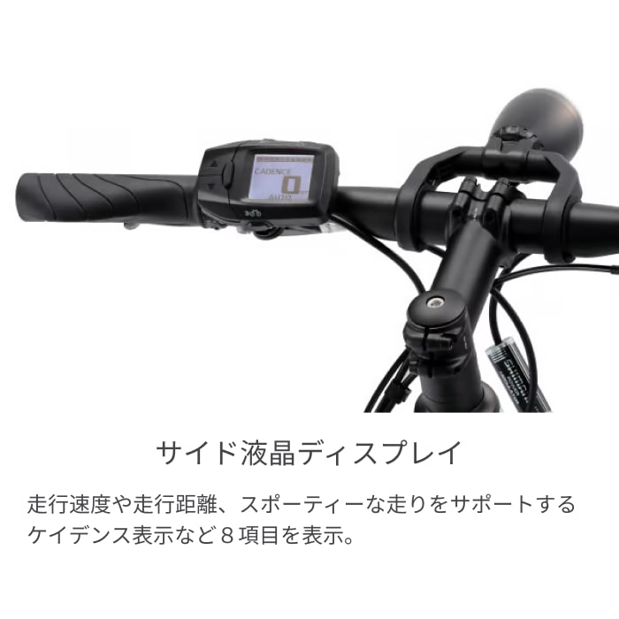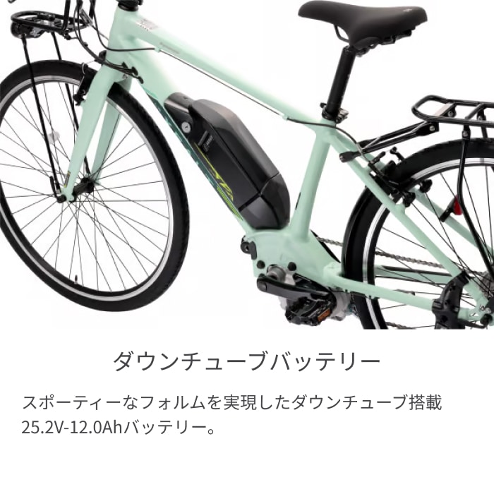 最長90km走行可能な大容量バッテリーを搭載し、毎日の通勤から週末のサイクリングまで幅広く活躍してくれる電動クロスバイクです。衝撃吸収性に優れながら、高速巡航を可能にする700×38Cタイヤに加え、平地から坂道まで様々な路面状況を快適に走れる外装8段変速を搭載するなど、快適な走行感を実現するためにこだわった充実スペックのモデル。スポーティなフレーム形状、グラフィックを採用!アルミフレームはワイヤーを内蔵しているため見た目もスッキリしており、デザインにも拘りが見える一台です。