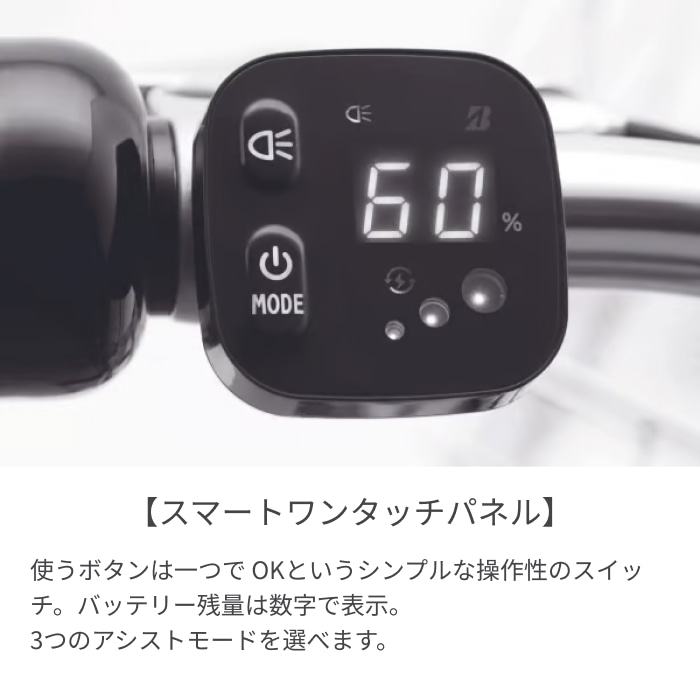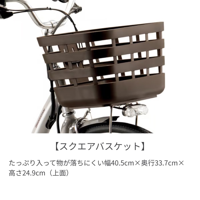 両輪駆動で強力にアシストするから平坦な道もきつい坂でも楽々!そしてなんといってもオススメはブリヂストン独自の回復充電機能。1回の充電で長く走れるので、毎日の通勤・通学にもぴったり。夜道も安心のオートテールライトに、おしゃれで荷物がすっぽり入るステンレスのワイドバスケット、世代問わずまたぎやすいフレーム形状、さらに耐パンク性能と軽い走行感をバランスした高性能タイヤまで全て装備しています。エコモード:200km、オートモード:105km、パワーモード:62kmで毎日の自転車ライフも安心してお乗りいただけます。