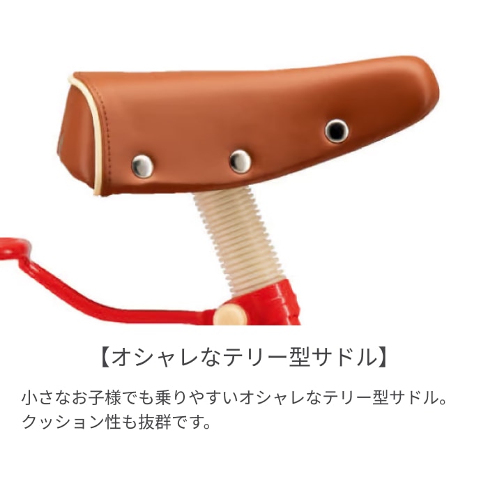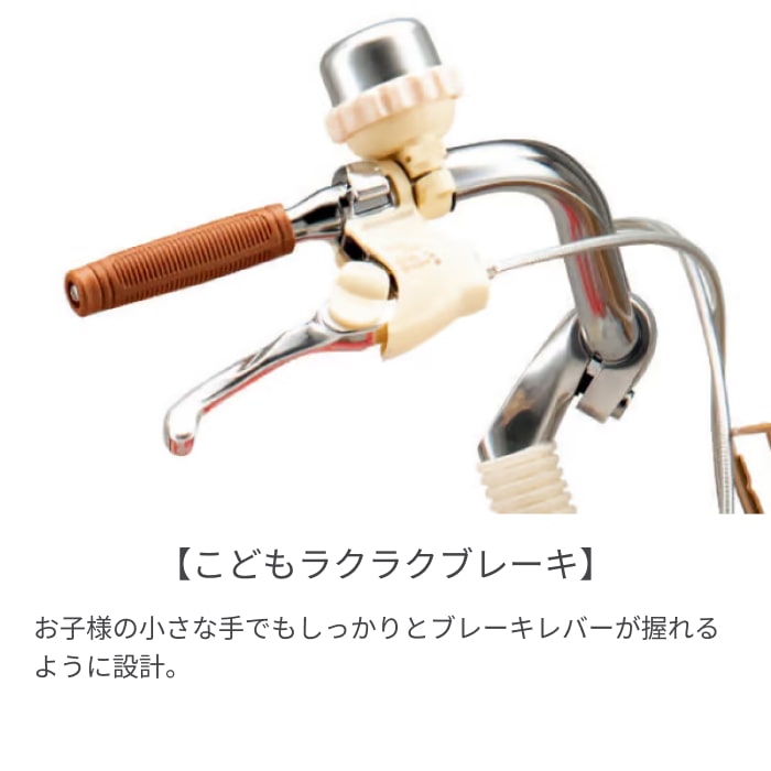 籐風バスケットやおしゃれで可愛い「はしご型フレーム」は大人用シティサイクル顔負けのデザインです。小さな手でもしっかり握れるラクラクブレーキや、より小さなお子様でも乗りやすいテリー型サドルなど、お子様が乗りやすい自転車です。さらに、自転車の安全基準をクリアしたBAAマーク付きなので、安心してお乗り頂けます。毎日お出かけしたくなる、そんな一台です。