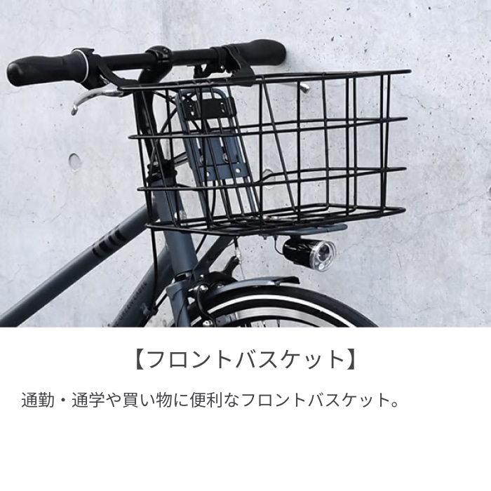 シーンを選ばず使えるMarkRosaに前カゴを取り付けた人気モデル。専用の前かごなのでスタイリッシュなデザインを邪魔せずおしゃれな雰囲気はそのままです。自転車は欲しいけど、普通のシティサイクルじゃ走りが不満。かといってスポーツバイクはスタンドも泥除けもないしちょっと不安……。ならば選択肢はマークローザ以外ありません!アルミフレームで軽量に仕上げた車体はシティサイクルより軽やかに走り、LEDオートライト、スタンド、泥除け標準装備で、スポーツ車のような不便さもありません。タイヤサイズは26インチと27インチからお選びいただけます。