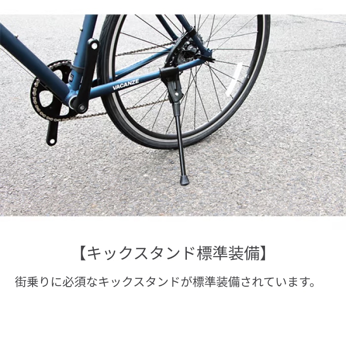 NESTOクロスバイクのエントリーモデルVACANZE 2は街乗りに必要なパーツを厳選した日常使いにぴったりの1台です。変速ギアはリアのみ7段変速ですが街乗りには十分のスペック。フロント変速がないため機動力は劣りますが、変速トラブルが減り、なおかつパーツ数が減る分リーズナブルな価格設定になっています。スポーツバイクでは後付けの場合もあるキックスタンドも標準装備し、カギと夜間走行用にライトさえあれば届いたらすぐに乗り出すことが出来ます!※2023年8月~車輪の固定方法がクイックリリースタイプからスキュワータイプ(六角レンチ固定)に変更となります。一定期間旧仕様と新仕様が混在いたしますがお選びいただくことは出来ませんので予めご了承ください。