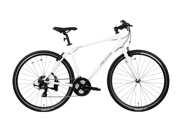ベル、スタンド等の装備が充実し、気軽に街乗りできるクロスバイクです。やや太めの32Cタイヤは空気量が多いため路面の凹凸や段差の衝撃を吸収し、安定感があり乗り心地もGOOD。信頼のシマノ製フロント3×リア7の21段変速機を搭載し、サイクリングにも十分対応できるギア幅です。新設計された軽量で頑丈なアルミフレームで日本人の体によりフィットするようになりました!重量も軽くなり、キビキビとした走りが魅力です。オプションパーツの泥除けなどを装着することで日常使いの利便性をさらに高めることができます。シティサイクルからの乗り換えでも安心して走ることができるので、最初のスポーツバイクとして選ぶには間違いのない一台です。