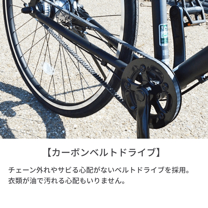 27インチタイヤの気軽に使えるクロスバイクが新登場。シンプルでスタイリッシュなフォルムに、内装5段変速、ライト、片足スタンドなどを標準装備。さらにアルミフレーム採用で車体が軽いため扱いやすく、カーボンベルトドライブでチェーン外れの心配いらずでメンテナンスフリー!通勤や日常生活に便利な機能が詰まった一台です。