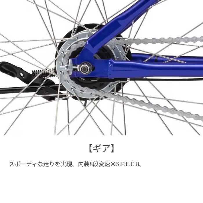 大容量バッテリーに加えて内装8段変速を採用し、長距離サイクリングをスポーティにこなす26インチ電動アシスト自転車です。路面の凹凸の衝撃を吸収してくれるサスペンション、優れた制動力とコントロール性を両立するフロントディスクブレーキなど充実の装備満載。バッテリーも大容量で、標準モードで約71kmと長距離のサイクリングも安心して走れます。