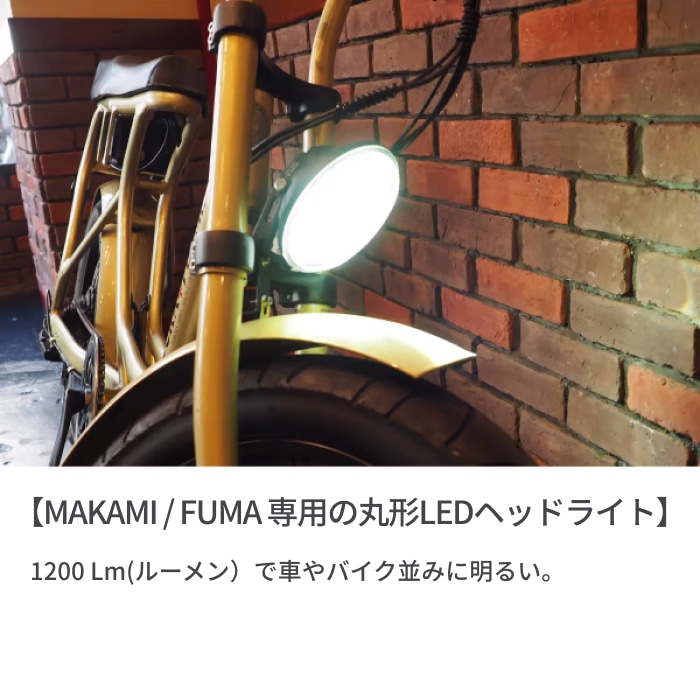 Tokyo Soul Shout Freedomをテーマにする「Rocka Flame」は当初アパレルブランドとして立ち上がりました。しかし、時代の流れと共にアパレル業界はどんどん衰退化していき、「Rocka Flame」の展開アイテムも次第に減っていきました。そんな中、日本での電動自転車シェア率の可能性に目を付け、毎日の通勤やショッピング等ライフスタイルに自由な個性を追求したい。そのテーマを持ちE-bike事業に乗り出しました。長年自転車業界に携わるプロデューサーが開発に関わり、型式認定基準ギリギリのパワー迄チューニングしたアシスト制御はファットタイヤのマッシブな車体を力強く後押しします。ただ、ラクをしたいからE-bikeに乗るのではなく「Rocka Flame」は、乗る人が移動の瞬間もワクワク・ドキドキできる新しいスタイルの自転車を提案をしていきます。モーターバイクのような個性的なルックスの「MAKAMI」はファットタイヤを装備したワイルドな車体で街中での注目度は抜群です。(※丸形LEDヘッドライトについて。メーカーオプションですがサイマでは自転車とセット販売とさせていただきます。自転車の販売価格にライト代が含まれています。別途カート追加は必要ありません。)