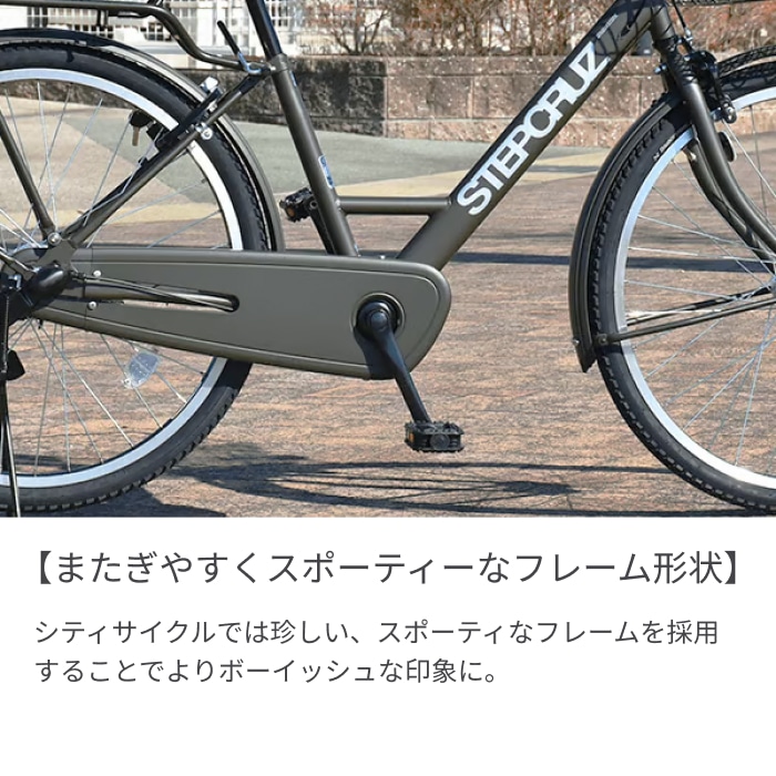 幅広い層から人気を集めるステップクルーズ。スポーティな極太フレームが目を引くフォルム。武骨な見た目とは裏腹に使いやすさは抜群です。太めのタイヤは振動吸収性や衝撃吸収性にも優れているので、段差の多い街中や路面走行をする場合にはピッタリの自転車です。ビジネスバッグもすっぽりと入る幅広のバスケット、内装式の変速機でメンテナンスはほぼなしでOK。男女ともに選びやすい、2つのタイヤサイズを取り揃えました。