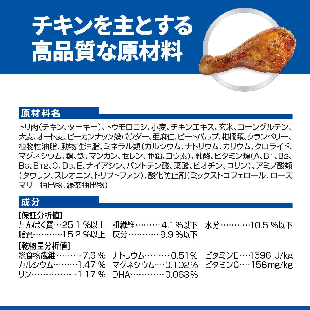 トリ肉(チキン、ターキー)、トウモロコシ、小麦、チキンエキス、玄米、コーングルテン、大麦、オート麦、ピーカンナッツ殻パウダー、亜麻仁、ビートパルプ、柑橘類、クランベリー、植物性油脂、動物性油脂、ミネラル類(カルシウム、ナトリウム、カリウム、クロライド、マグネシウム、銅、鉄、マンガン、セレン、亜鉛、ヨウ素)、乳酸、ビタミン類( A、B1、B2、B6、B12、C、D3、E、ナイアシン、パントテン酸、葉酸、ビオチン、コリン )、アミノ酸類(タウリン、スレオニン、トリプトファン)、酸化防止剤(ミックストコフェロール、ローズマリー抽出物、緑茶抽出物)