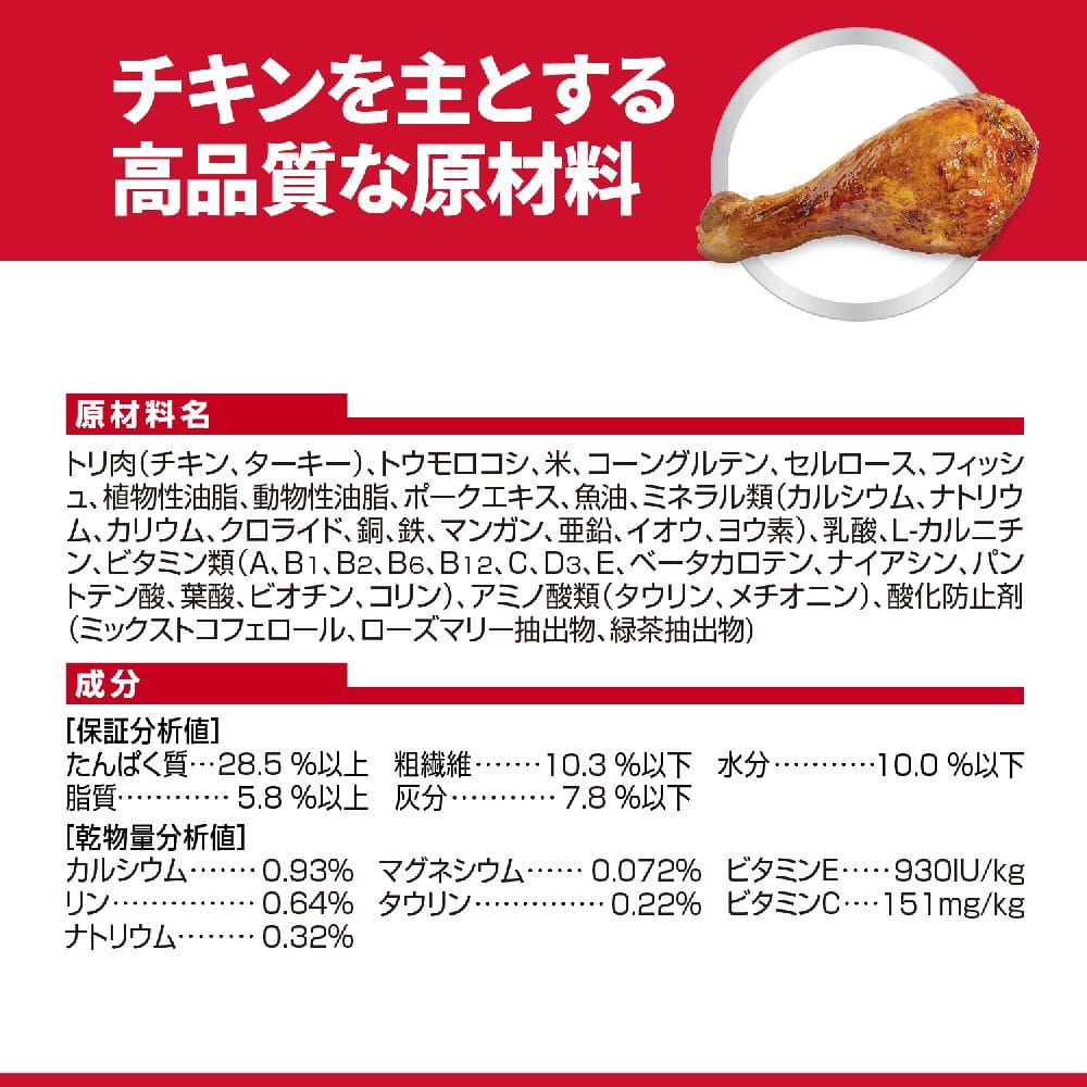 トリ肉(チキン、ターキー)、トウモロコシ、米、コーングルテン、セルロース、フィッシュ、植物性油脂、動物性油脂、ポークエキス、魚油、ミネラル類(カルシウム、ナトリウム、カリウム、クロライド、銅、鉄、マンガン、亜鉛、イオウ、ヨウ素)、乳酸、L-カルニチン、ビタミン類(A、B1、B2、B6、B12、C、D3、E、ベータカロテン、ナイアシン、パントテン酸、葉酸、ビオチン、コリン)、アミノ酸類(タウリン、メチオニン)、酸化防止剤(ミックストコフェロール、ローズマリー抽出物、緑茶抽出物)