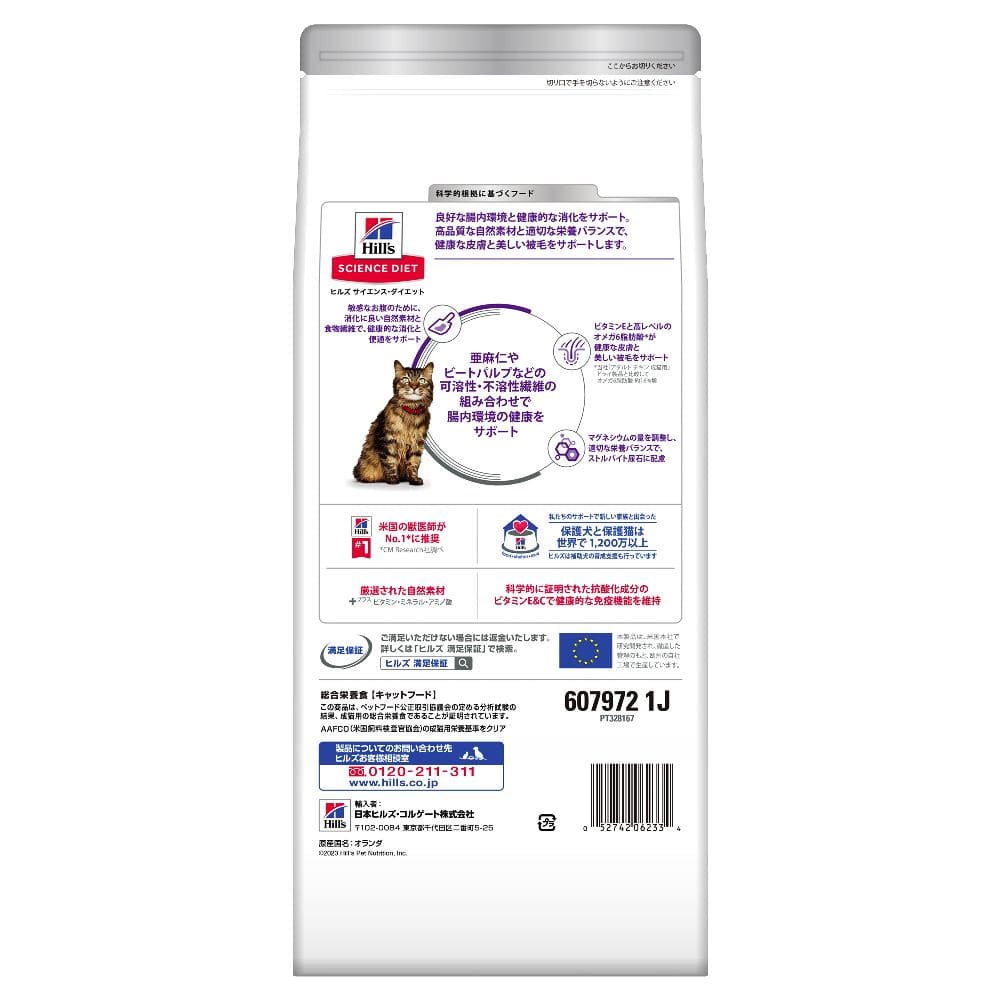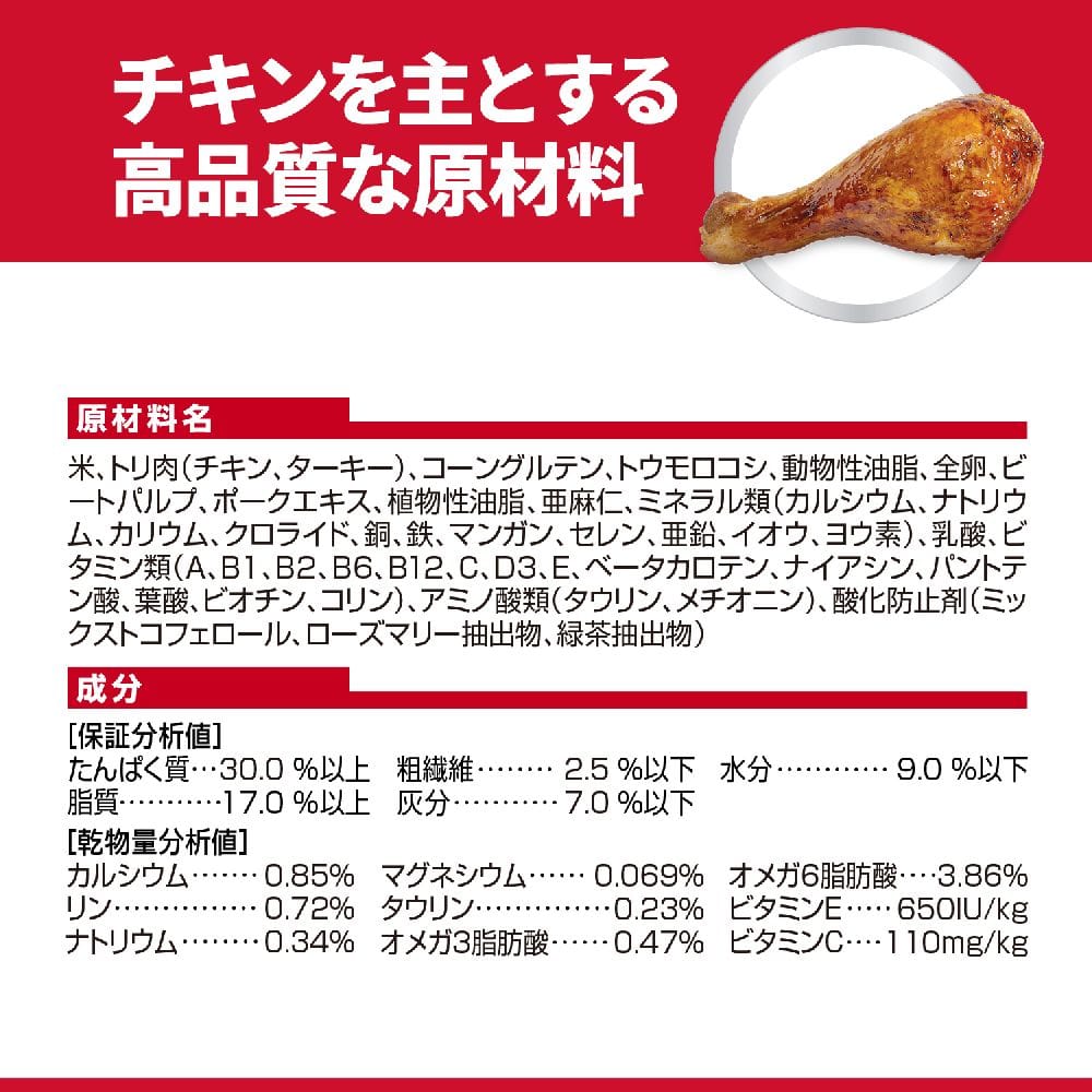 米、トリ肉(チキン、ターキー)、コーングルテン、トウモロコシ、動物性油脂、全卵、ビートパルプ、ポークエキス、植物性油脂、亜麻仁、ミネラル類(カルシウム、ナトリウム、カリウム、クロライド、銅、鉄、マンガン、セレン、亜鉛、イオウ、ヨウ素)、乳酸、ビタミン類(A、B1、B2、B6、B12、C、D3、E、ベータカロテン、ナイアシン、パントテン酸、葉酸、ビオチン、コリン)、アミノ酸類(タウリン、メチオニン)、酸化防止剤(ミックストコフェロール、ローズマリー抽出物、緑茶抽出物)