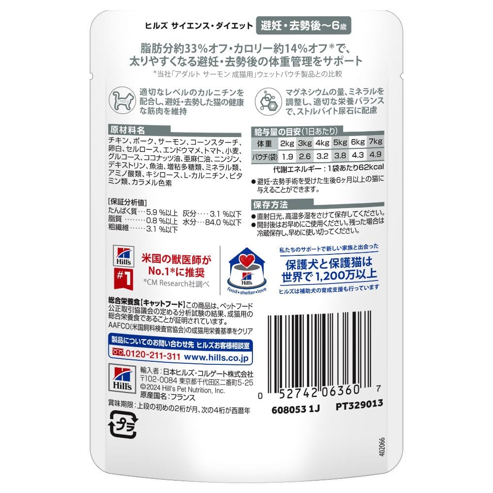 脂肪分約33%オフ・カロリー約14%オフ(当社「アダルト サーモン 成猫用」ウェットパウチ製品との比較)で、太りやすくなる避妊・去勢後の体重管理をサポート