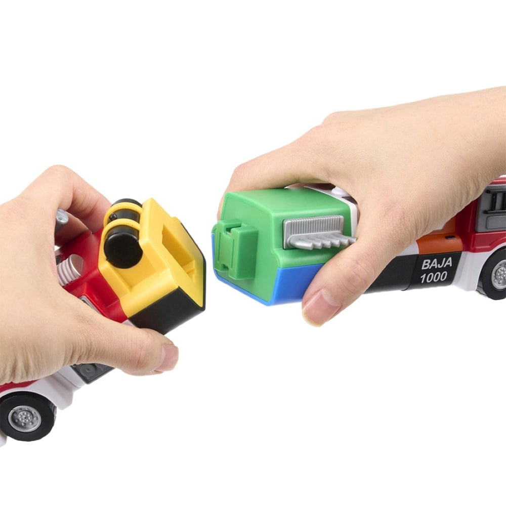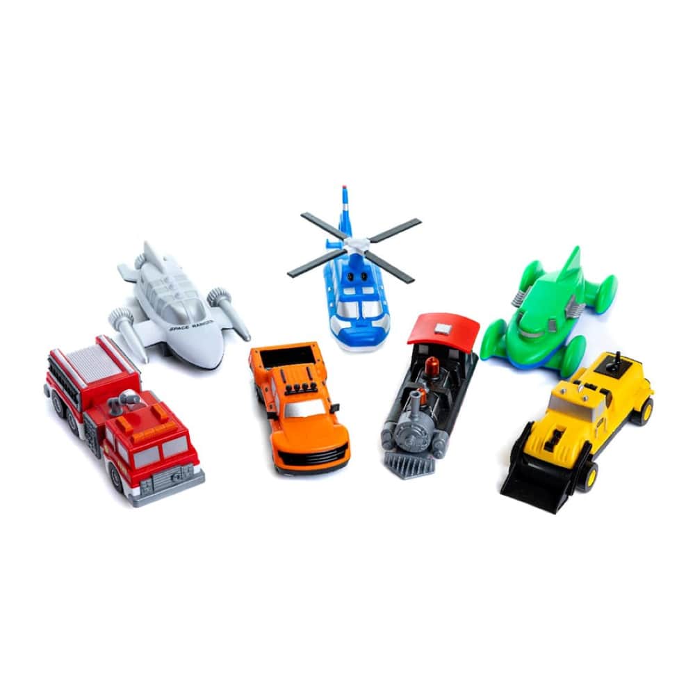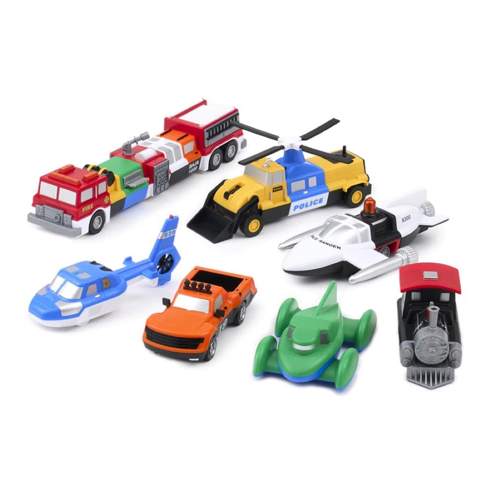 磁石の力で簡単につけたり外したりできるボディを自由に組み合わせ、頭の中に思い描いた想像の乗り物が完成する「ミックス&マッチシリーズ」のデラックス版。消防車・スペースレンジャー・ピックアップトラック・ポリスヘリコプター・蒸気機関車・スピードレーサー・ホイールローダーと働きが異なる7種の乗り物がセットになっています。車が大好きなお子様にぴったりのセットです。 小さな手で遊びやすいサイズ感・子どもっぽ過ぎないデザインと最低限のギミックで安全に楽しく遊べます。ホイールローダー・消防車・スピードレーサーはプルバック式。後ろに引っ張り手を離すとゆっくりと直進します。重量(g)1,570g