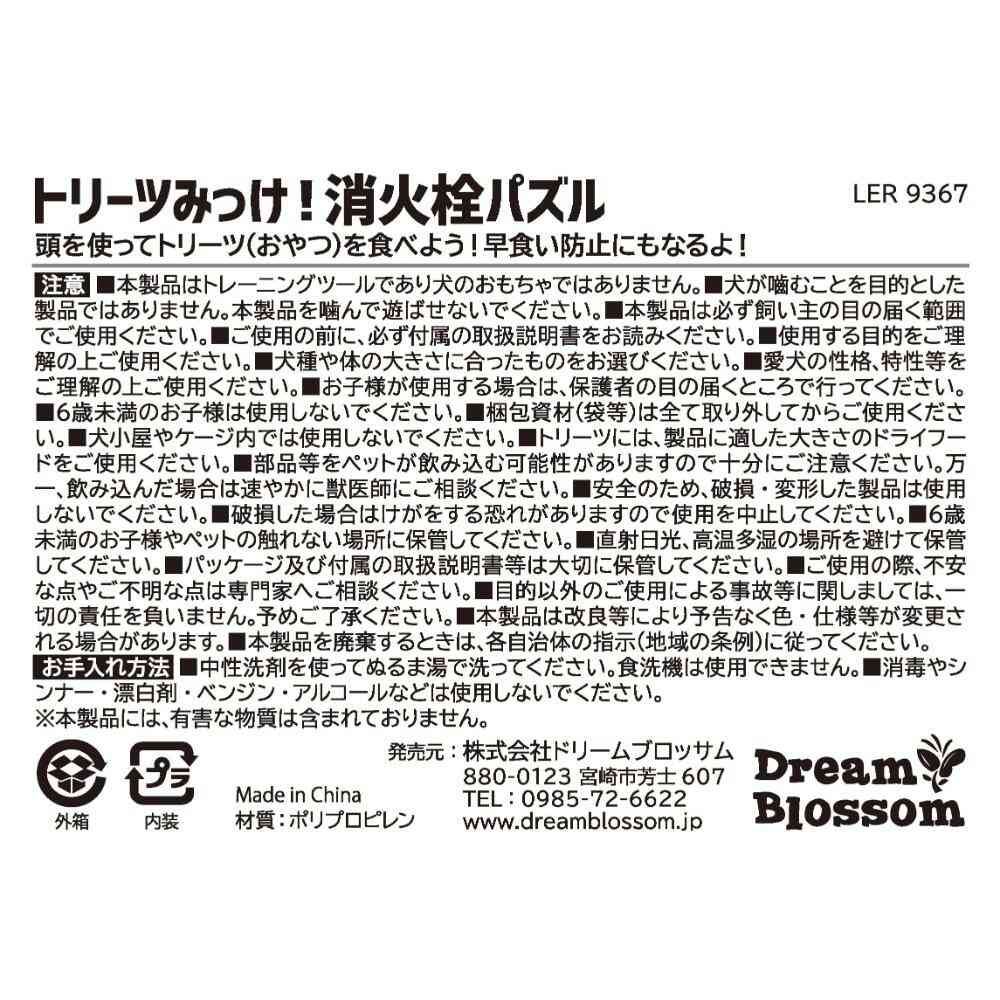 ・「トリーツみっけ!消火栓パズル」は、早食い防止により愛犬への胃の負担軽減、ストレス解消にも役立ちます。おやつを探すことでノーズワークのスキルアップに繋がりいつものおやつ時間をより楽しく脳トレ時間に! ・はじめは、トリーツ(おやつ)が簡単に食べられるようにフタを外して与え、愛犬の様子をみながら難易度を調整しましょう。クルクル回る消火栓は遠心力でトリーツをゲットできます。開口部を狭くすると難易度がアップ!レベル1~レベル3まで、与え方や接し方を日本語ガイドで解説。愛犬に合ったレベルでチャレンジを見守りましょう。 ・がむしゃらにトリーツを探す?それとも慎重ににおいを嗅ぐ?トリーツトレーニングで愛犬の性格が見えてきます。愛犬の性格を知る事で大切な家族との絆を深められるペット用知育トイです。 ・セット内容:トレイ×1個、支柱×1個、消火栓×3個
