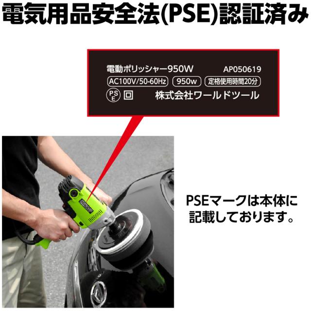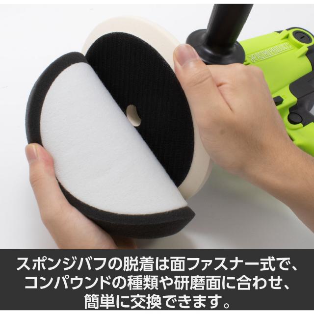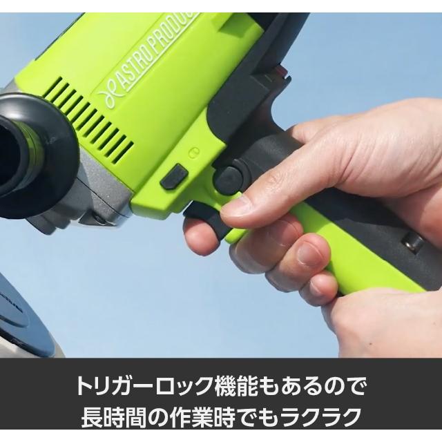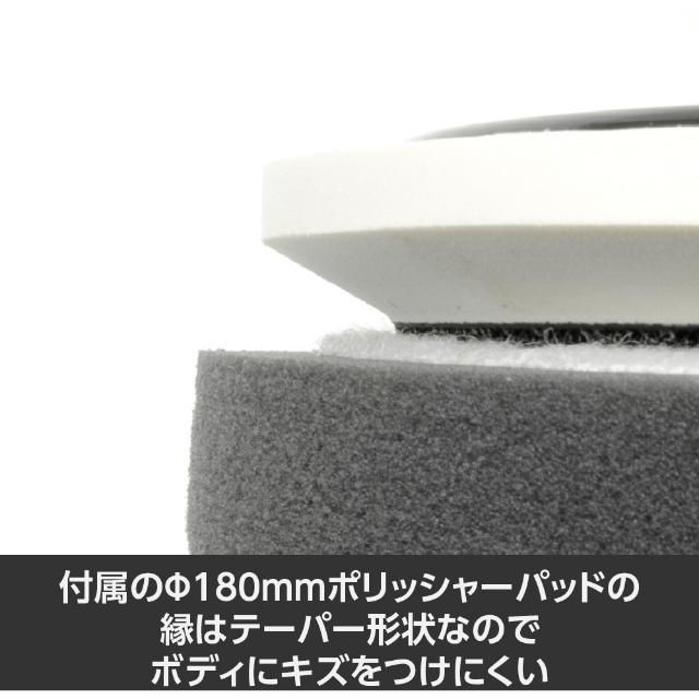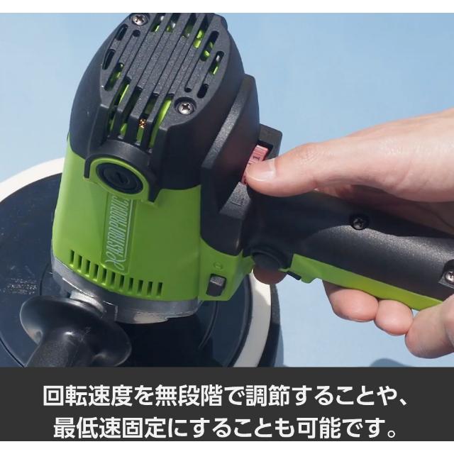 ●洗車キズや水垢落としなど車のボディー磨きには欠かせない電動ポリッシャーです。●ポリッシャーパッドは面ファスナー式なのでコンパウンドの種類や研磨面に合わせて簡単にスポンジバフを交換できます。●回転速度はダイヤルで無段階に調整ができ低速と調整した速度をワンタッチで切替できるセレクトスイッチを装備しています。●トリガースイッチは作動状態でロックができるので作業中の負担を軽減しました。●付属のハンドルは左右どちらにも取り付け可能です。●無負荷回転数(min[[の-1乗]]):600~2000●パッド寸法(mm):180●ペーパー寸法(mm):180●電源(V):100●電源コード長さ(m):5●消費電力(W):950●定格電流(A):9●本体サイズ:L215×W91×H230mm●アンビルサイズ:M16×2.0●本体機能:無段階速度調整●定格使用時間:約20分●パッド動作:シングルアクション●電源:AC100V 質量2.3kg