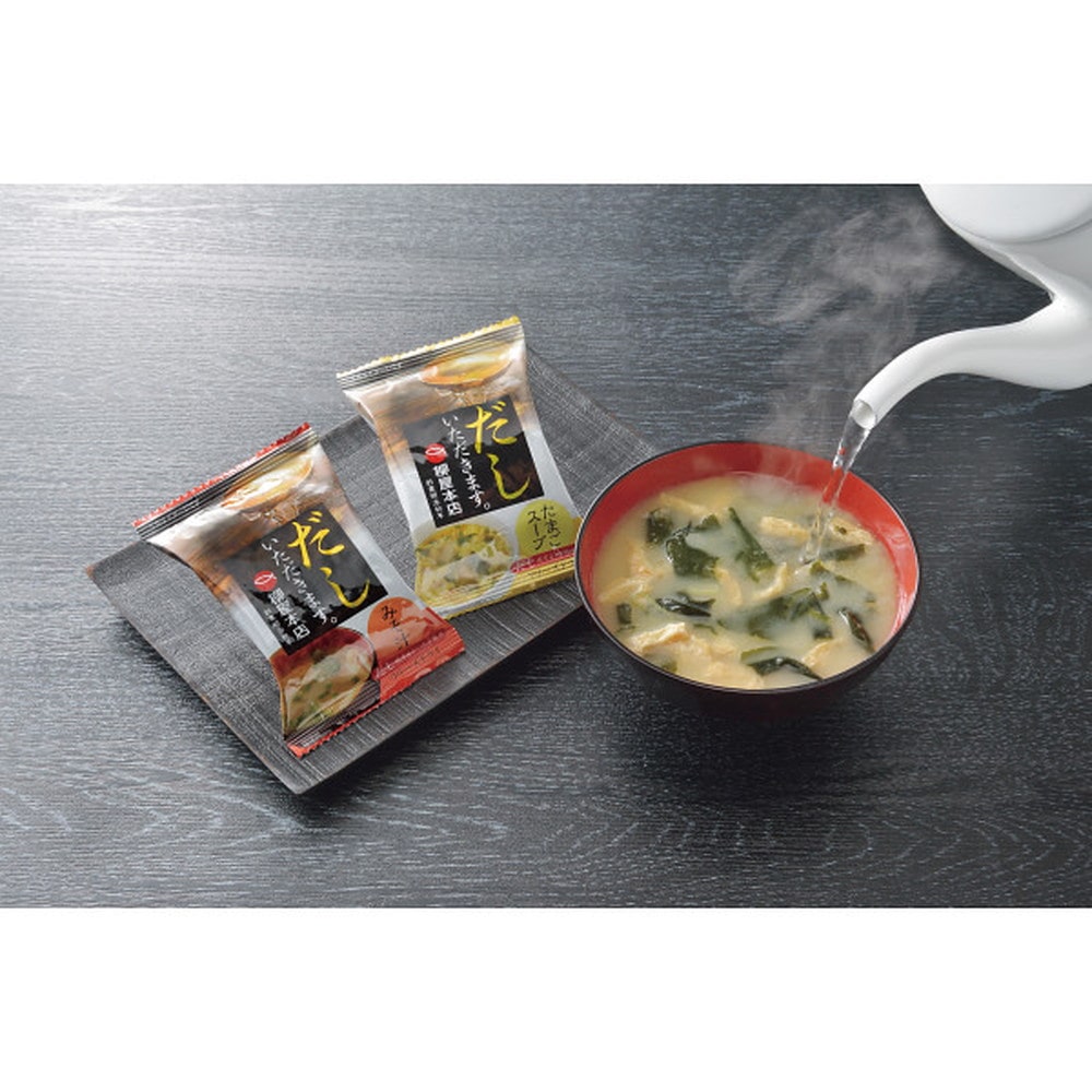 ●にんべん鰹削り節(3g×3袋)×1、にんべん鰹節そぼろ(10g×3袋)×1、にんべん鰹だしの素(6g×8袋)×1、フリーズドライ味噌汁9.8g×3、フリーズドライ玉子スープ5.4g×3