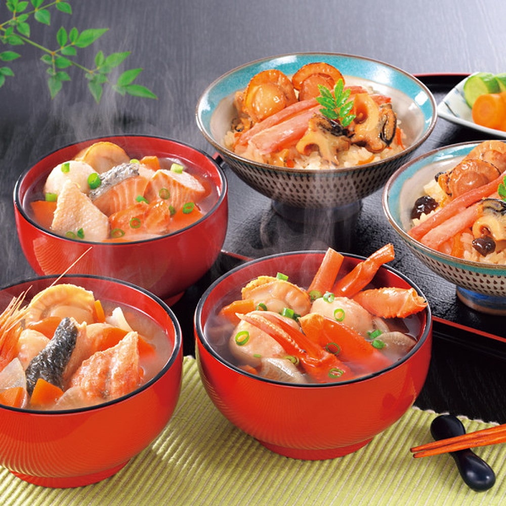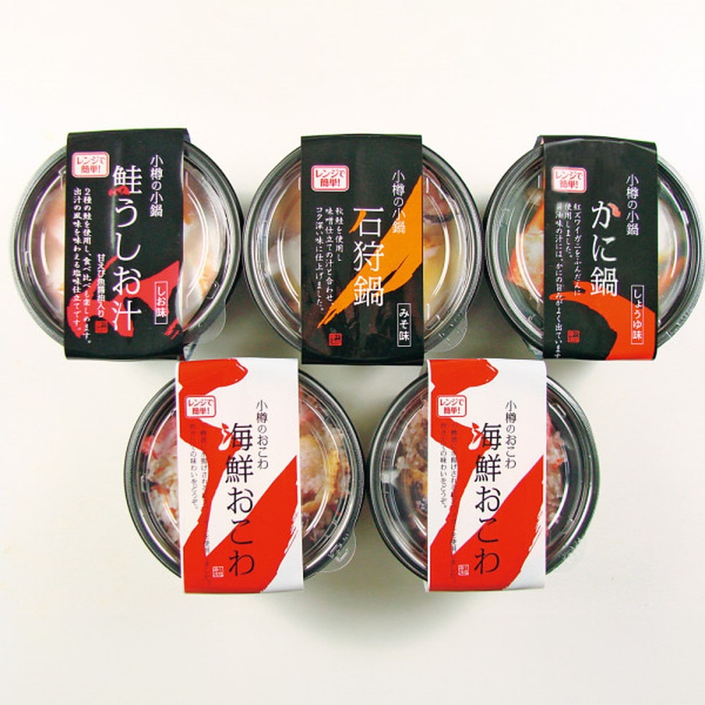 ●海鮮おこわ170g×2、石狩鍋280g・かに鍋280g・鮭うしお汁280g×各1(北海道小樽製造)