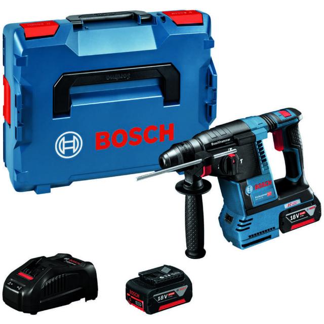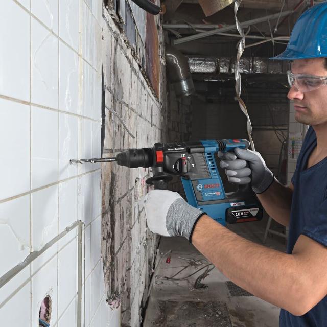 ●打撃力2.6Jのパワーと破つり作業も可能な3モード搭載で幅広い作業が可能です。●細径ソフトモード搭載:ソフトスタートになり、最大打撃数の70%に抑えられます。●キックバック防止機構で安全作業が可能です。●低振動設計●正転・逆転機構●暗所作業に威力を発揮するLEDライト装備●別売の吸じんアダプター(GDE18V-16)装着可能でクリーンな作業を実現します。●無負荷回転数(min[[の-1乗]]):0~890●打撃数(min[[の-1乗]]):0~4350●本体寸法(mm):348×225×83●バッテリー電圧(V):18●色:ブルー●穴あけ能力(mm)鉄工:13●穴あけ能力(mm)コンクリート:26●穴あけ能力(mm)木工:30●ドリル径(mm):SDSプラス●消費電力(W):425●能力:コンクリート26mmφ、ダイヤモンドコア68mmφ、鉄工13mmφ、木工30mmφ●定格電圧:DC18V(ボッシュプロ用充電式専用バッテリー)●バッテリー容量:5Ah●回転数:0~890min-1(回転/分)●振動3軸合成値:破つり時8.5m/s2●打撃力:2.6J 質量3.5kg