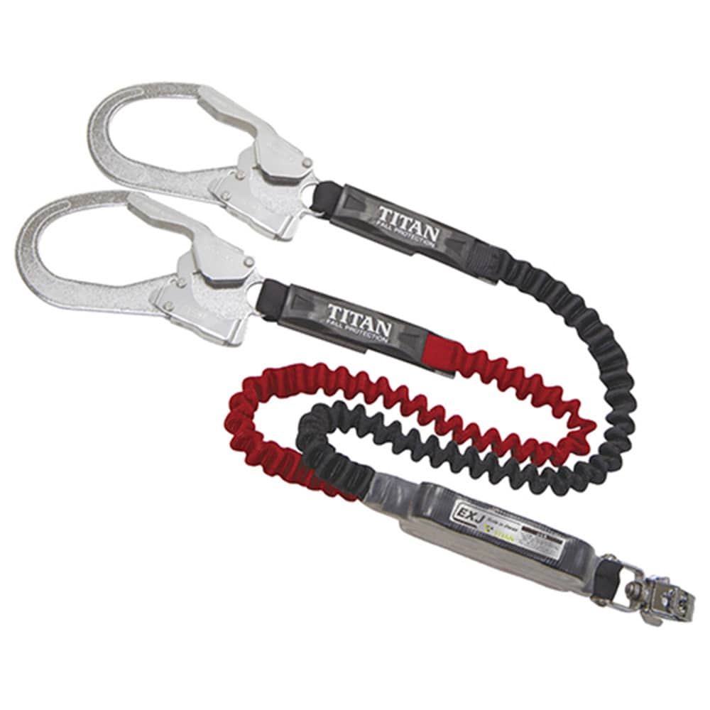 軽量で使いやすく、作業姿勢に応じて伸縮するダブルランヤードです。 フルハーネス用ランヤード。 軽量な伸縮式のダブルランヤードです。 ●ストラップ:ゴム芯入りポリエステル被覆(ブラック/レッド)。 ●全長:約1600mm(ストラップ収縮時約1100mm)。 ●幅:約27mm。 ●ショックアブソーバ:第一種(4kN)。 ●フック:No.56A(軽量タイプ)。 ●D環側コネクタ:DJMR環(回転機能付き)。 ●重量:約1130g。
