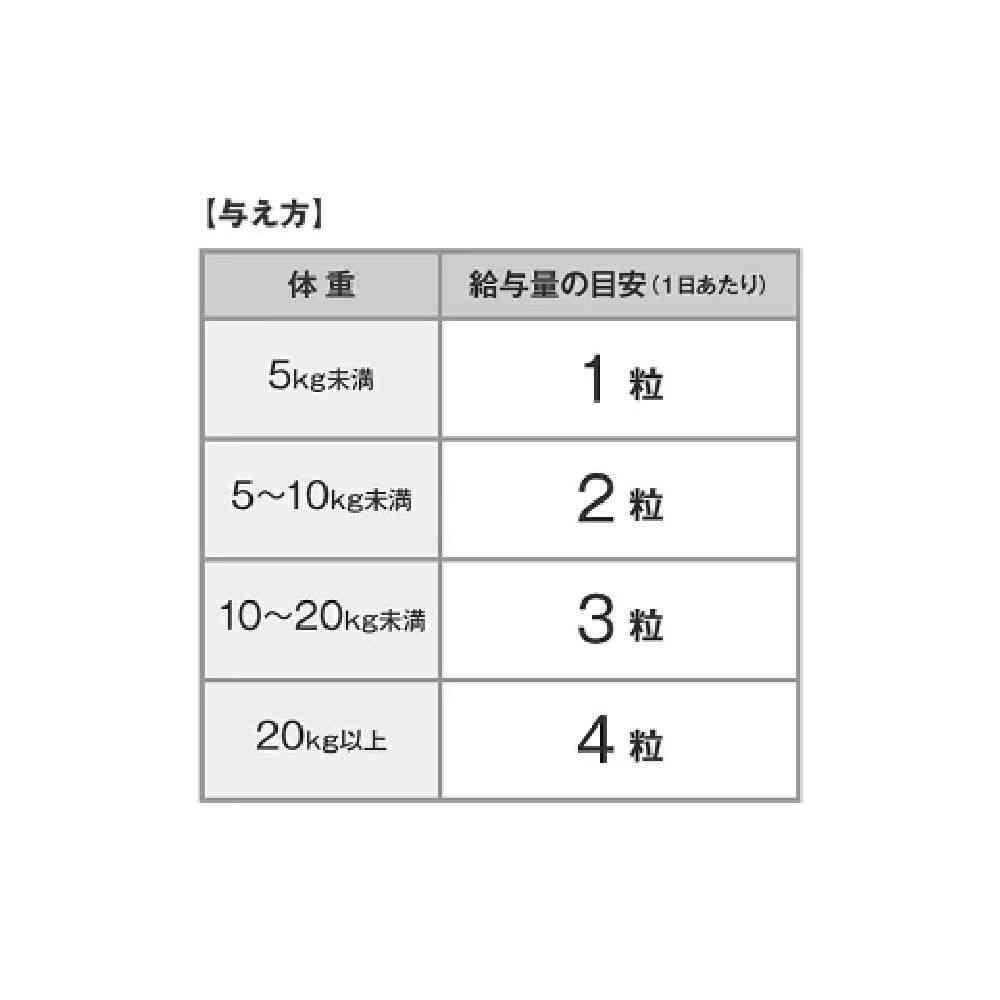 本品は犬用健康補助食品です。 手にのせるなどして、そのまま与えるかいつものフードに混ぜて与えてください。 生後3カ月未満の幼犬には与えないでください。 過剰に給与することはさけ、1日の目安量を守ってください。 体重/給与量の目安(1日あたり) 5kg未満・・・・・・1粒 5~10kg未満・・・・2粒 10~20kg未満・・・3粒 20kg以上・・・・・4粒