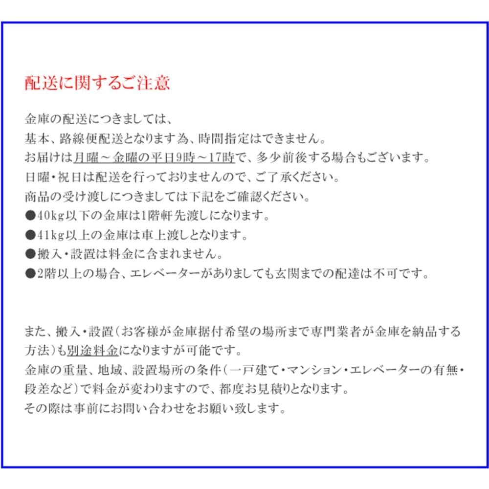 キータイプ耐火金庫!A4サイズが収納できます。【耐火金庫の有効耐用年数は製造後20年】半永久的に使えると思われがちな耐火金庫ですが、耐火材である気泡コンクリートに含まれる水分が長期使用により気化してしまい、本来の耐火性能を発揮することができなくなります。日セフ連では、耐火金庫の有効耐用年数の基準を製造後20年として、これを目安に買換えやセキュリティーの見直しをおすすめしています。【配送に関する注意事項】※40kg以下の金庫のお届けは1階軒先渡しのみとなります。41kg以上の金庫は車上渡しのみとなります。エレベーターがありましても2階以上の配達はできませんのでご了承ください。※搬入・設置は別途料金がかかりますので、お問い合わせください。