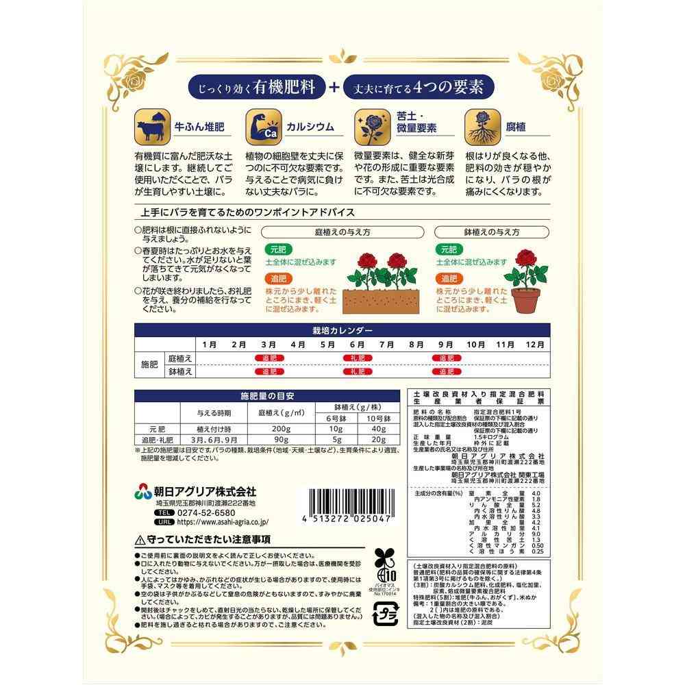 肥料成分にプラスしてバラを丈夫に艶やかに育てる 牛ふん堆肥、カルシウム、微量要素、苦土、腐植を同時に施せます。