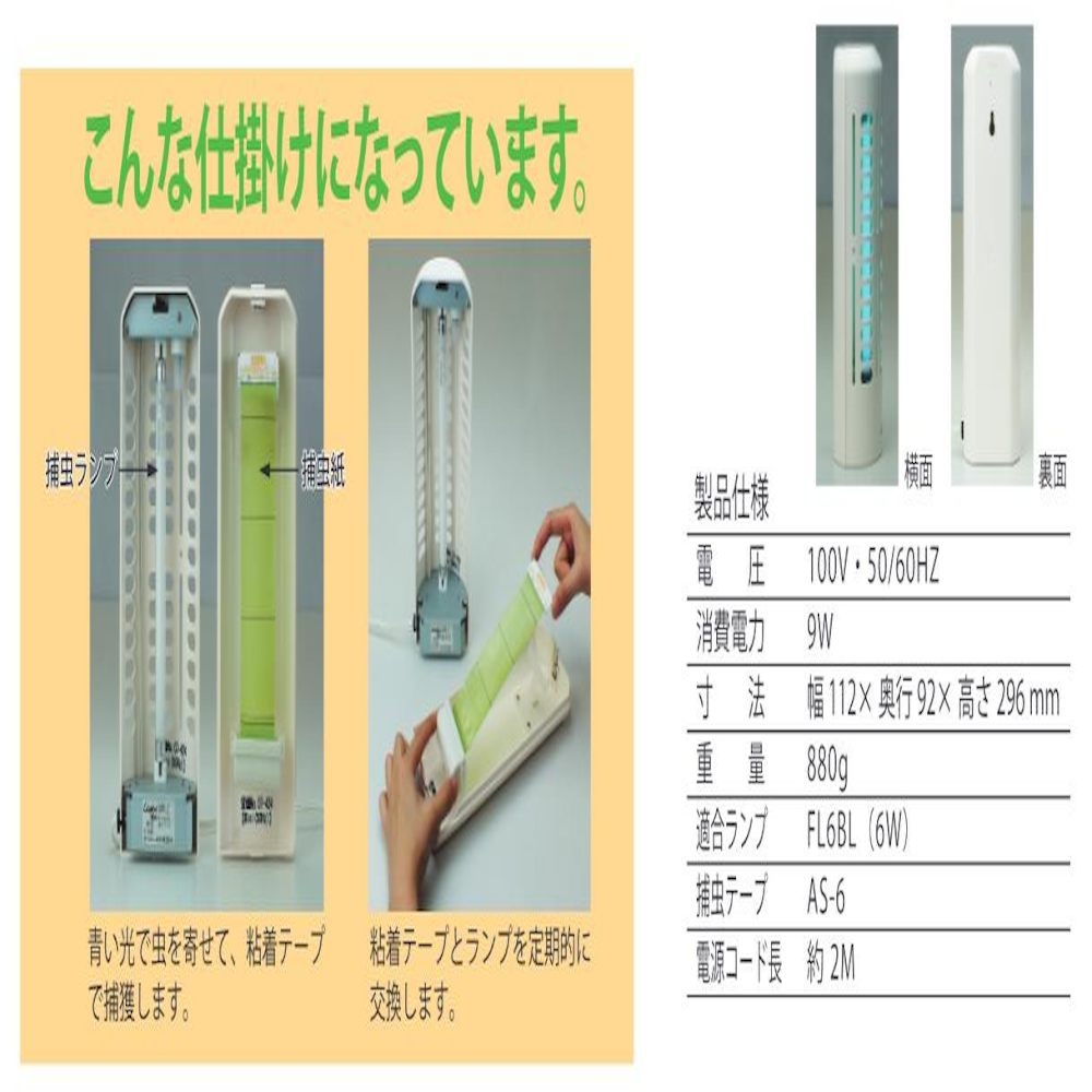 サイズ:幅112×奥行92×高さ296mm、重量:880g、仕様:電源:100V、電圧/消費電力:100V/9W、コード長:2m、交流電流使用の有無(付属部品も含む):50/60Hz両対応、付属品:捕虫紙S-6(1個)、取扱説明書、保証書(保証期間:12ヶ月)