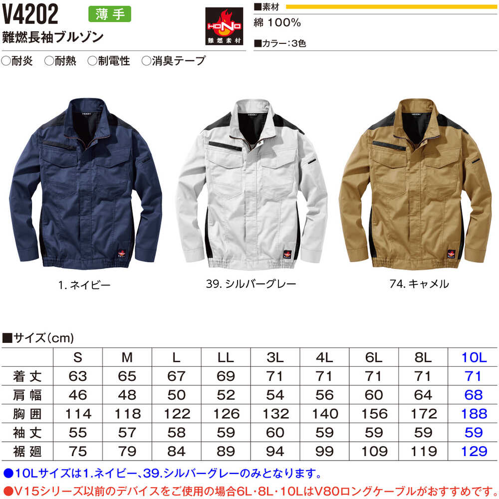 ●快適ウェア着用時は、快適ウェア専用のファン・バッテリーを必ずご使用下さい。●他社商品と組み合わせて使用した際に発生する故障や事故につきましては責任を負いません。●快適ウェア用バッテリーセット(品番V1501:バッテリー、充電器付)が別途必要です。●快適ウェア用ファンセット(バッテリー接続ケーブル附属)が別途必要です。(品番:V1502-20ファン色ブラック、V1502-15ファン色メタリックシルバー)●服のみです。ファン・バッテリーセットは別売りです。