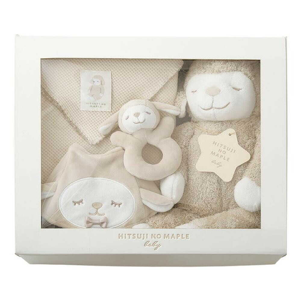 《ひつじのメイプル》シリーズより初のベビー用品が登場しました。 小さくてやわらかい赤ちゃんにも寄り添えるベビーメイプル。 出産やハーフバースデイ、1歳のお誕生日のお祝いなどにギフトセットがおススメです。 【セット内容】 ・ラトル ・スタイ(リバーシブル) ・ぬいぐるみ ・ワッフルケット ・専用ボックス付き