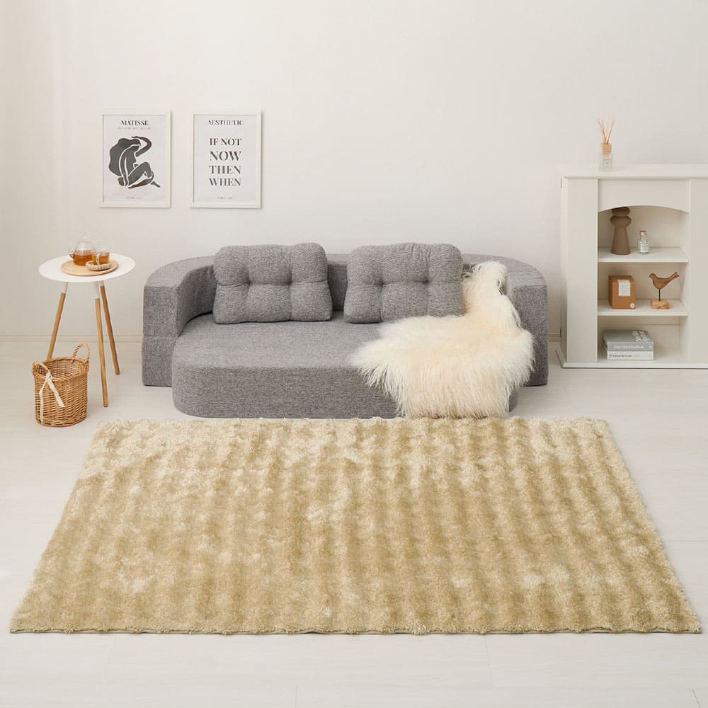 表面をなめらかな凹凸にカットし、独特なポコポコ感を表現。目付量約1100g/m?のしっかりとした密度でボリューム感たっぷりの贅沢な一枚に。光沢のある糸は光の当たり方によって様々な表情をみせてくれます。また、ホルムアルデヒドの試験を乳幼児の基準でクリアしているため、小さなお子さまやペットの居るご家庭でも安心です。裏面にはラグのずれを防止する滑り止め加工付き。ホットカーペットや床暖房の上に敷いてもお使いいただけます。