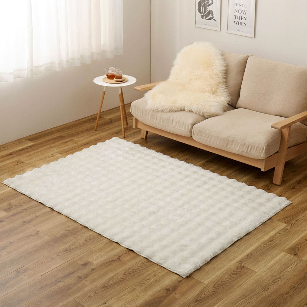 表面をなめらかな凹凸にカットし、独特なポコポコ感を表現。目付量約1100g/m?のしっかりとした密度でボリューム感たっぷりの贅沢な一枚に。光沢のある糸は光の当たり方によって様々な表情をみせてくれます。また、ホルムアルデヒドの試験を乳幼児の基準でクリアしているため、小さなお子さまやペットの居るご家庭でも安心です。裏面にはラグのずれを防止する滑り止め加工付き。ホットカーペットや床暖房の上に敷いてもお使いいただけます。
