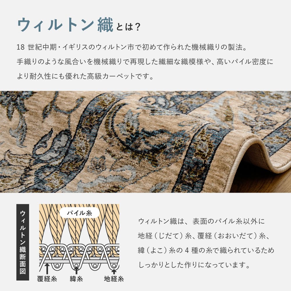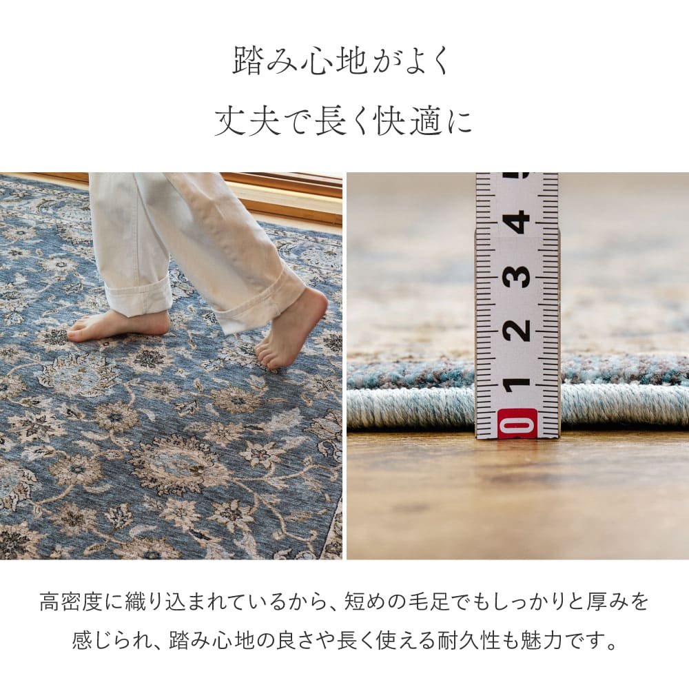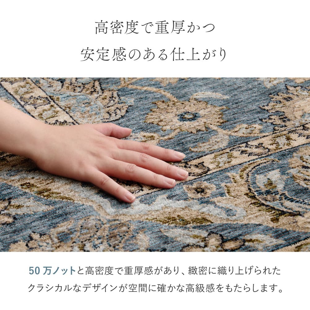 格式高い伝統柄と深みのある色合い、クラシカルなペルシャ調デザインをベースに、繊細な花柄モチーフを緻密に織り上たウィルトンラグ。 500,000ノットの高密度なパイルは、短めの毛足ながらもしっかりとした厚みを感じられ、踏み心地の良さや長く使える耐久性も魅力です。床暖房やホットカーペットとの併用も可能で、冬は暖かく夏も快適に。 気品あるデザインと高い実用性を兼ね備えたこのラグで、お部屋にワンランク上のインテリアコーディネートを取り入れてみませんか。