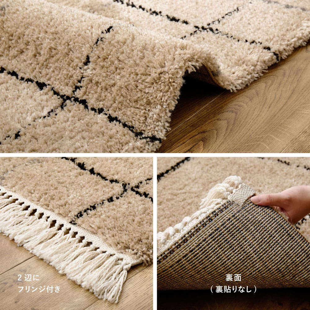 ヒートセット加工により、なめらかな触感と遊び毛の出にくさにも配慮。ホットカーペット・床暖房対応で、季節を問わず一年を通して使用できます。落ち着いたデザインはワンルームからリビングまで取り入れやすく、ソファ前やベッドサイドなど、日常のさまざまなシーンで活躍するウィルトンラグです。