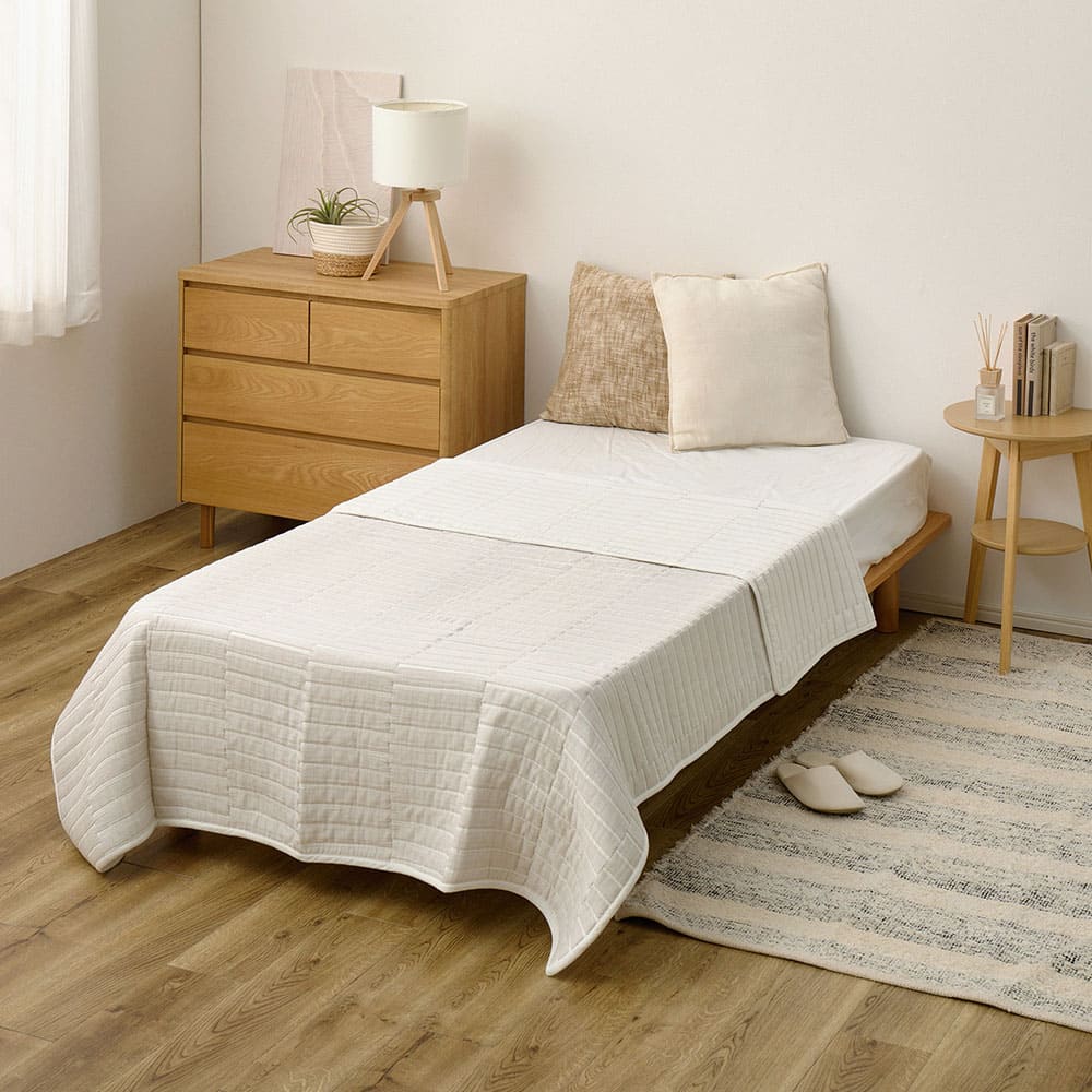 コットン100%のやさしさに包まれて、自然素材ならではの心地よさを感じるガーゼケット。肌に優しく、通気性・吸湿性の高いコットン素材は、夏はさらっと涼しく、冬は暖かさを感じられ、年中快適にお使いいただけます。毎日気兼ねなく使えるよう、ご家庭で気軽に丸洗いOK。また、洗うたびにやわらかさが増していくのも嬉しいポイント。日々の暮らしに寄り添いながら、使うほどふんわりと馴染みます。柔らかなトーンのやさしい色合いに、ふっくらと立体的な織りでナチュラルな中にも高級感のあるデザイン。インテリアに自然と溶け込みながらも、さりげない華やかさをプラスしてくれるアイテムです。