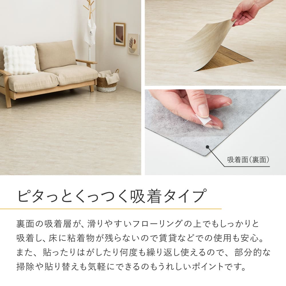 貼ってはがせて、何度も繰り返し使えるフロアタイル。フィルムをはがして、床の上から貼るだけでお部屋を簡単にイメージチェンジできます。超薄型&軽量なので施工も簡単!賃貸や新築の床への汚れや傷の防止にも。キッチンや洗面所など水周りにも使えて、粘着が落ちても水で洗えば繰り返しご使用いただけます。カッターで簡単にカットでき、お部屋に合わせて敷き詰められます。