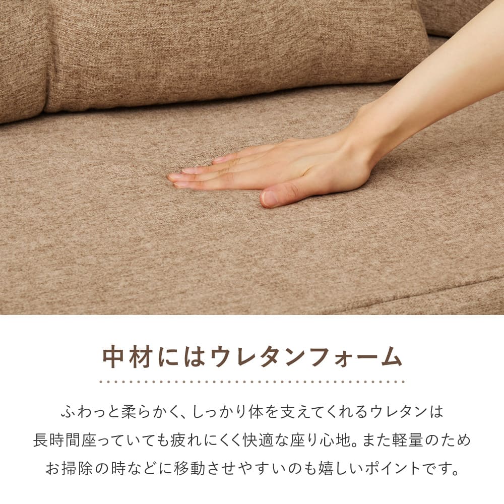 【ソファ本体】 側生地:ポリエステル100% 中材:ウレタンフォーム 【クッション】 側生地:ポリエステル100% 中材:ポリエステル、ウレタンフォーム