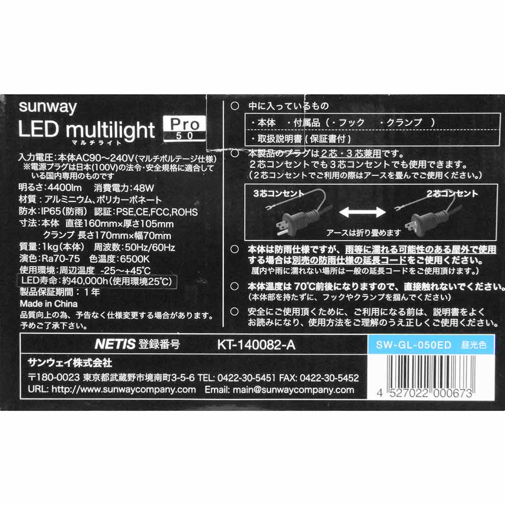 使い勝手にこだわったLEDマルチライトです。 作業、DIY、修理、看板、防犯、お庭、レジャーなどの照明。 衝撃に強い頑強ボディです。 安心して使える防雨型IP65です。 フック&クランプ同梱でどこにも取り付け可能です。 ●全光束:4400ルーメン。 ●消費電力:48W。 ●電圧:90~240V(但し付属のプラグは100V専用)。 ●色温度:6500K(昼光色)。 ●使用環境温度:-25度~+45度。 ●LED寿命:約40000時間(使用環境25度)。 ●電源ケーブル長さ:5m。 ●付属品:フック・クランプ。