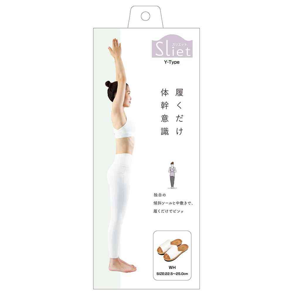 体の重心を後ろに意識させることで、下腹、ヒップ、ふくらはぎにキュッと力が入り体幹が鍛えられ体のラインを整えるスリッパです。 立ちヨガの基本ポーズ「山のポーズ」にヒントを得て生まれたスリエットY-Type。 スリエットY-Typeは独自の傾斜ソールと中敷きで足裏全体で地面を支えて、履くだけで姿勢ピンッ。 <ポイント1>体幹を意識。斜め傾斜で体の重心が自然と後ろに意識。美しい姿勢に導きます。まるでヨガをしているときのような凛とした気分を体感ください。 <ポイント2>足裏全体で地面をつかむインソール。親指の付け根、小指の付け根、かかとの3点でしっかりと底をつかみます。この3点を意識することで土踏まずが引きあがり足裏のアーチができます。