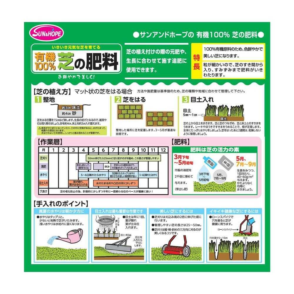 植物に合わせて調整された専用肥料です 100%有機原料を使用しています。 粒が細かいので、すみずみまで肥料が行きわたり、芝生が色鮮やかで美しくなります。