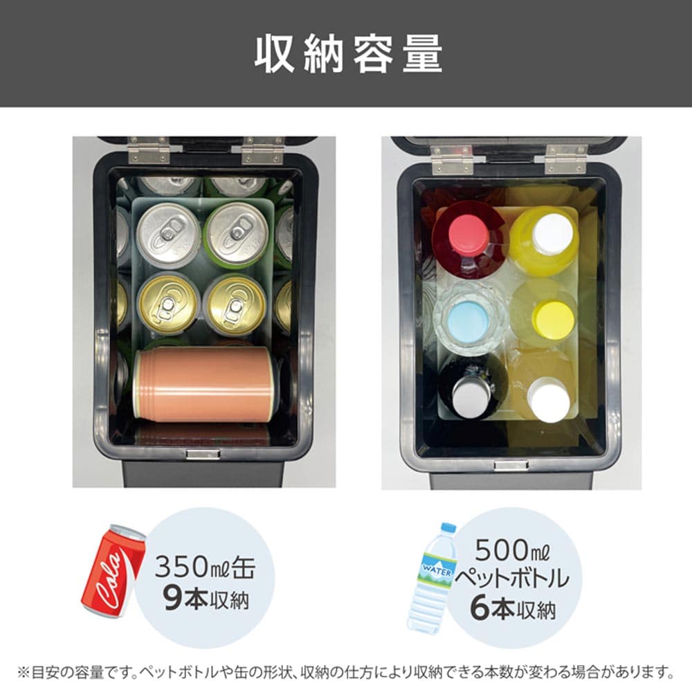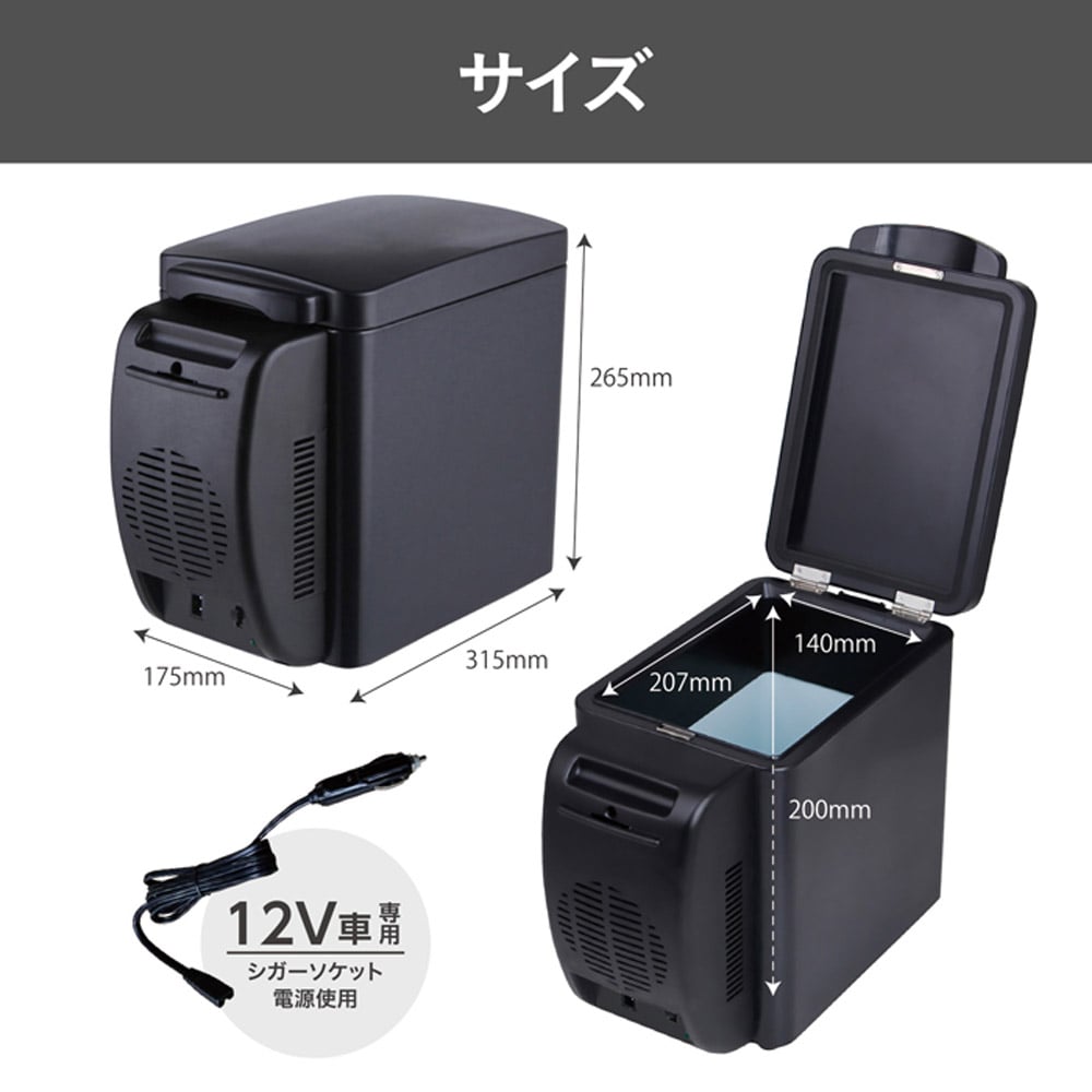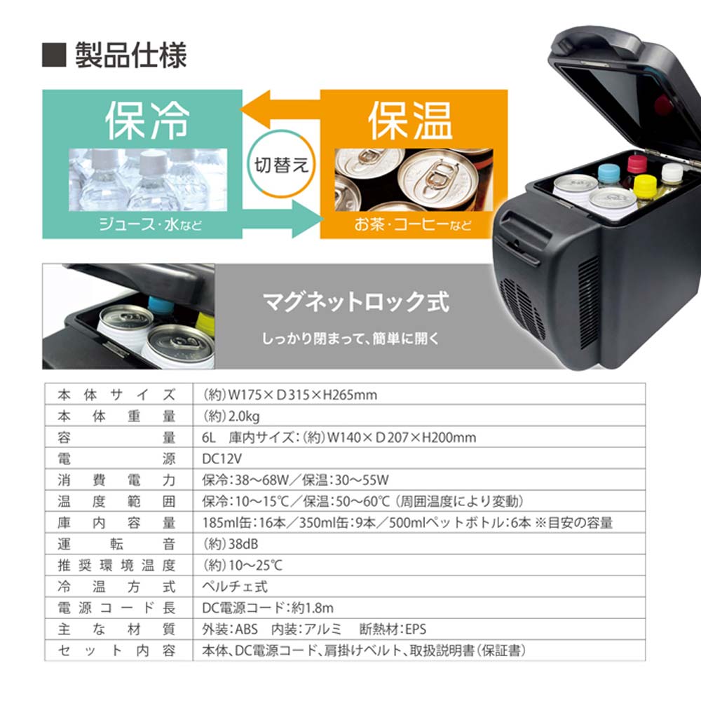 ●シガーソケットにつなぐだけ。ドリンクを車で保冷・保温で美味しく。 ●1台2役「保冷&保温」で貯蔵:アイスでもホットでも1年中ドリンクを車の中で飲み頃に ●アウトドア、ドライブ、車中泊に:車に1台あるととっても便利な冷温庫 ●シガーソケットにつなぐだけ:付属の電源ケーブルをシガーソケットに差すだけ ●保冷と保温はスイッチ1つで切替え:面倒な設定などがないから使いやすい ・本体サイズ:(約)W175×D315×H265mm ・庫内サイズ:(約)W140×D207×H200mm ・本体重量:約2.0kg ・容量:6L ・収納目安:185ml缶:16本/350ml缶:9本/500mlペットボトル:6本 ・冷温方式:ペルチェ式 ・電源:DC12V ・消費電力:保冷:38~68W/保温:30~55W ・温度範囲:保冷:10~15C/保温:50~60C(周囲温度により変動) ・運転音:約38dB ・推奨環境温度:約10~25C ・材質: (外装):ABS (内装)アルミ (断熱材)EPS ・電源コード長:約1.8m ・保証期間:ご購入日より6ヶ月間(但し、メーカー保証規定に基づきます。)