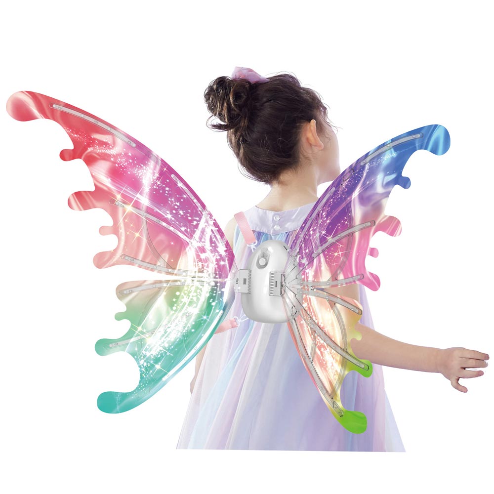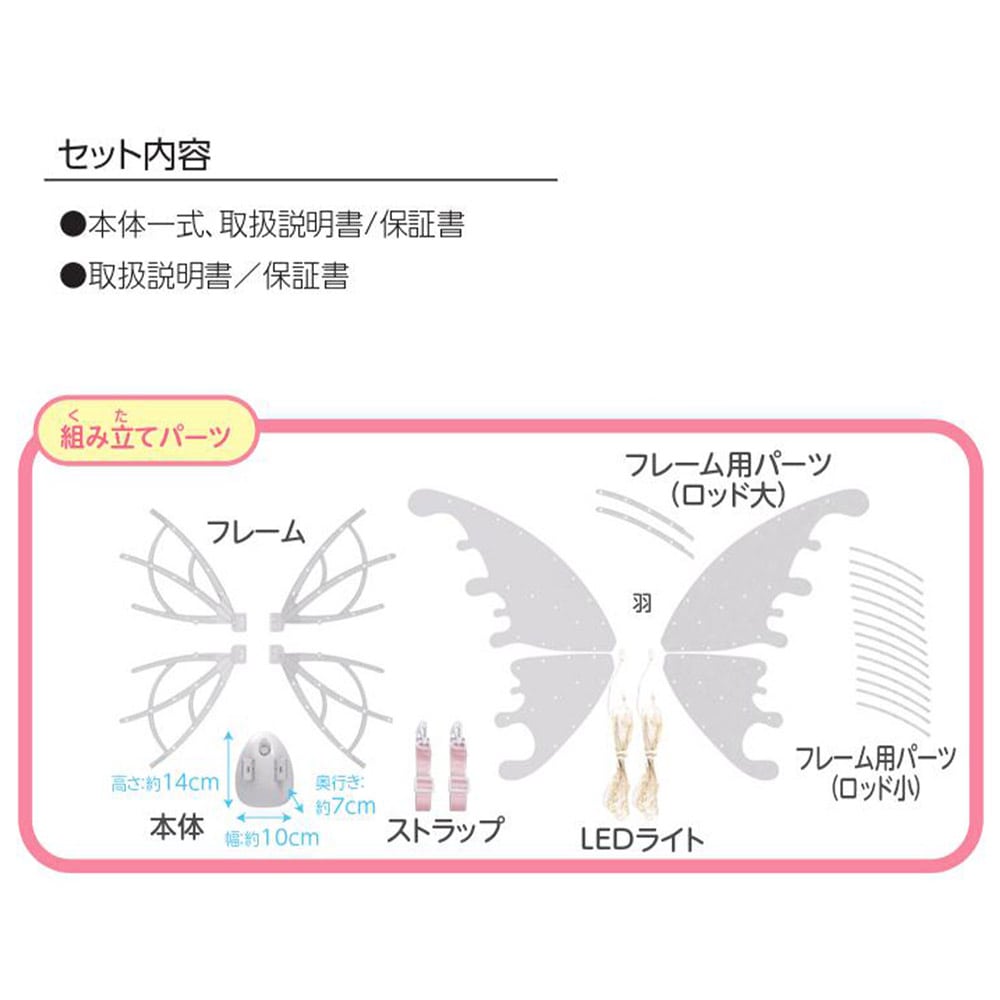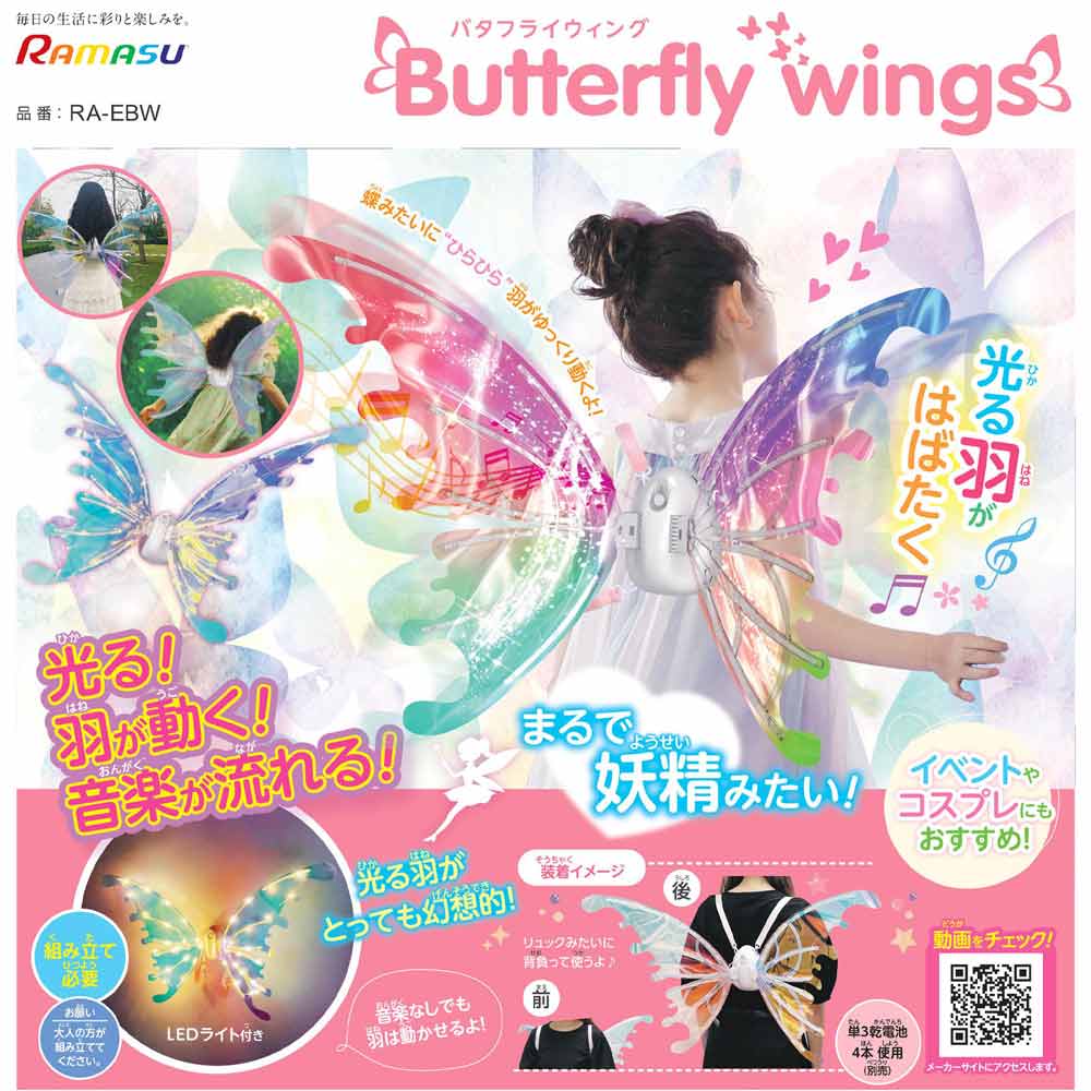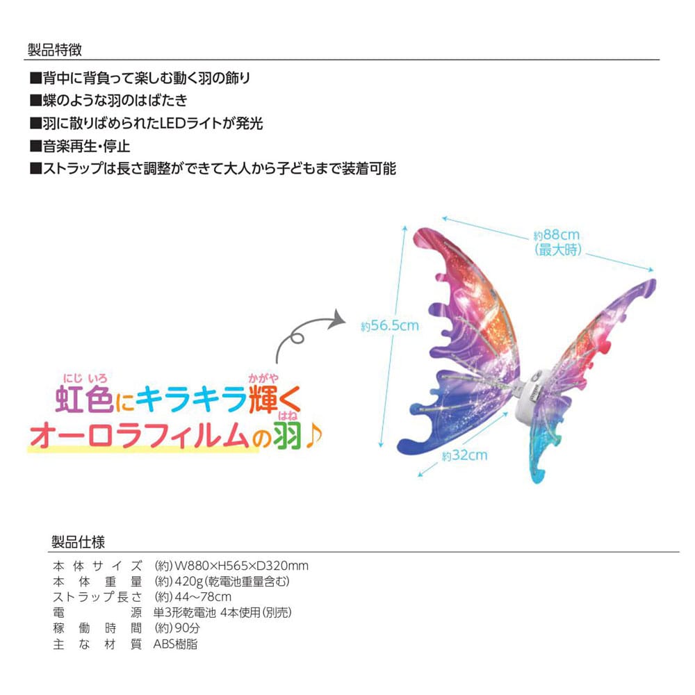 ●光る!羽が動く!音楽が流れる!背中に背負えて、本物の羽みたい! ●音楽が流れ、光る蝶の羽が羽ばたく!:※音楽は止めることもできます。 ●パーティやイベント、コスプレ用にもオススメです! ・商品名:バタフライウィング ・型番:RA-EBW ・本体サイズ(約):W880×H565×D320mm ・本体重量(約):420g(乾電池重量含む) ・ストラップ長さ(約):44~78cm ・電源:単3乾電池 4本使用(別売) ・稼働時間(約):90分 ・主な材質:ABS樹脂 ・主な機能:音楽再生・停止、羽のはばたき、発光 ・付属品:本体一式、取扱説明書/保証書 (ご使用前にご確認ください) ※商品は組み立て式となります。組み立ての際は大人の方がお願いします。 ※小さなお子様(概ね3歳未満)がご使用になる際は、必ず保護者の方の目の届く範囲でご使用ください。 ※可動部分に指や髪の毛などを挟まないようご注意ください。