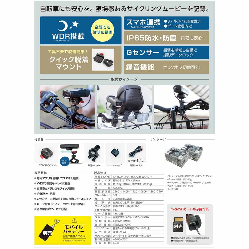 ●スマホと連携する自転車のためのドラレコ ●専用アプリでスマホと連携:リアルタイム映像表示、データ管理など ●WDR搭載:夜間でも鮮明に撮影 ●IP65防水・防塵:雨でも安心して走行可能 ●Gセンサー搭載:衝撃を感知し、自動でファイルをロック ・本体サイズ:約W35×L117×H27mm ・本体重量:105g(付属品一式取付時/約213g) ・材質:ABS+PC ・画像解像度:2560×1440P/1920×1080P/1280×720P ・フレームレート:30fps ・カメラ:368万画素CMOS ・視野角:対角130°、水平120°、垂直64° ・ファイル形式:動画/MP4 静止画/JPG ・防水・防塵性能:IP65 ・ループ録画:1分/3分 ・Gセンサー:内蔵(OFF/LOW/MID/HIGH) ・夜間撮影:可能(WDR搭載) ・録音機能:内蔵(ON/OFF) ・microSDカード:容量8~128GB対応(Class10以上) ・入力電源:USB 5V 2A ・バックアップ電源:スーパーキャパシタ内蔵+ボタン電池 ・動作環境温度:-20C~70C