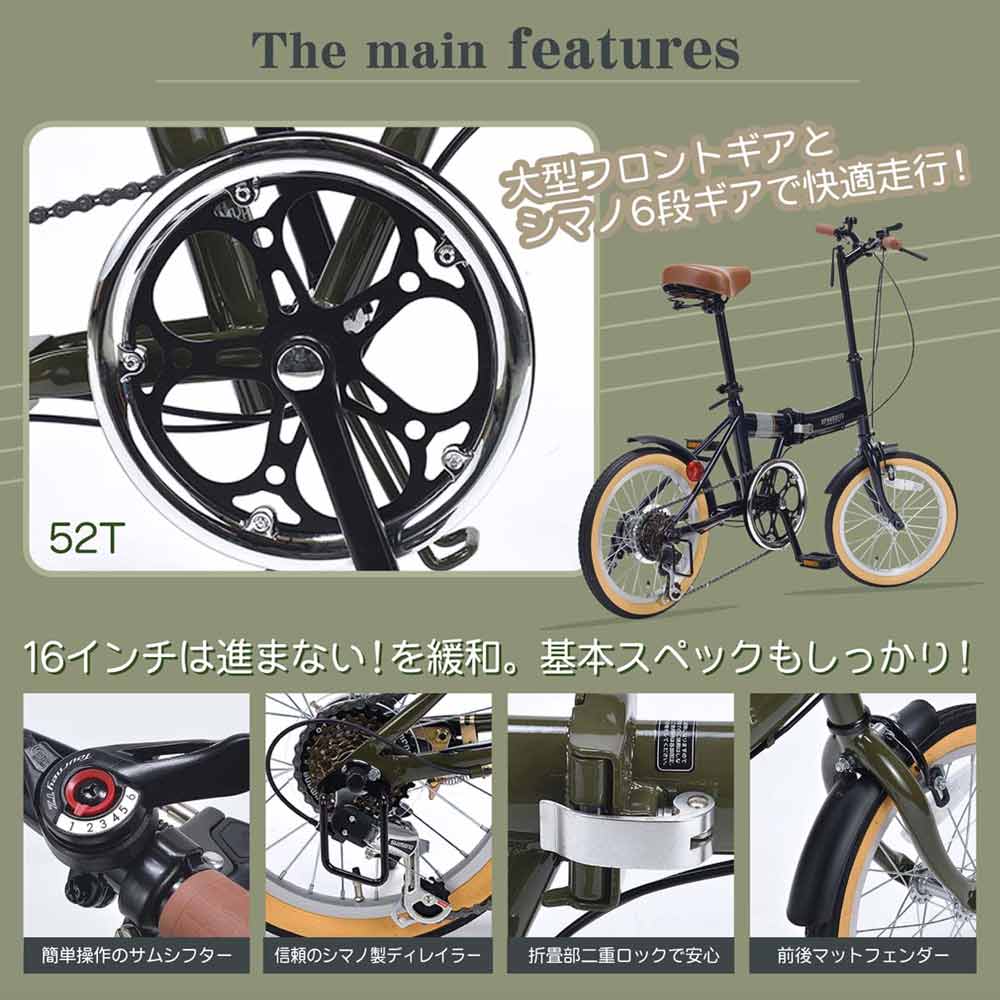 ●コンパクトだから車に積んだり用途も広かる! ●大人から子供まで家族で使えるデイリーアイテム! ●大型フロントギア+シマノ製6段変速付で快適走行! ●コレクション性もある厳選フレームカラー! 本体サイズ(mm)H860~940×W550×L1320 外箱・折畳サイズ(mm)H600×W360×L770 サドル高さ(mm)670~840 本体重量(N・W)約14.0kg 梱包重量(G・W)約16.5kg 適応身長135cm~ 適応体重75kg以下 JIS耐振動試験合格品 フレーム/スチール リム/アルミ シフター/シマノ(サムシフト) ディレイラー/シマノ 前輪ブレーキ/キャリパーブレーキ 後輪ブレーキ/バンドブレーキ 備考/折畳ジョイント部二重ロック方式 Wギアカバー 他