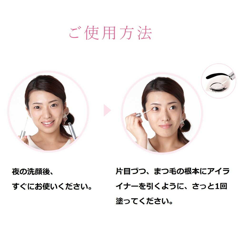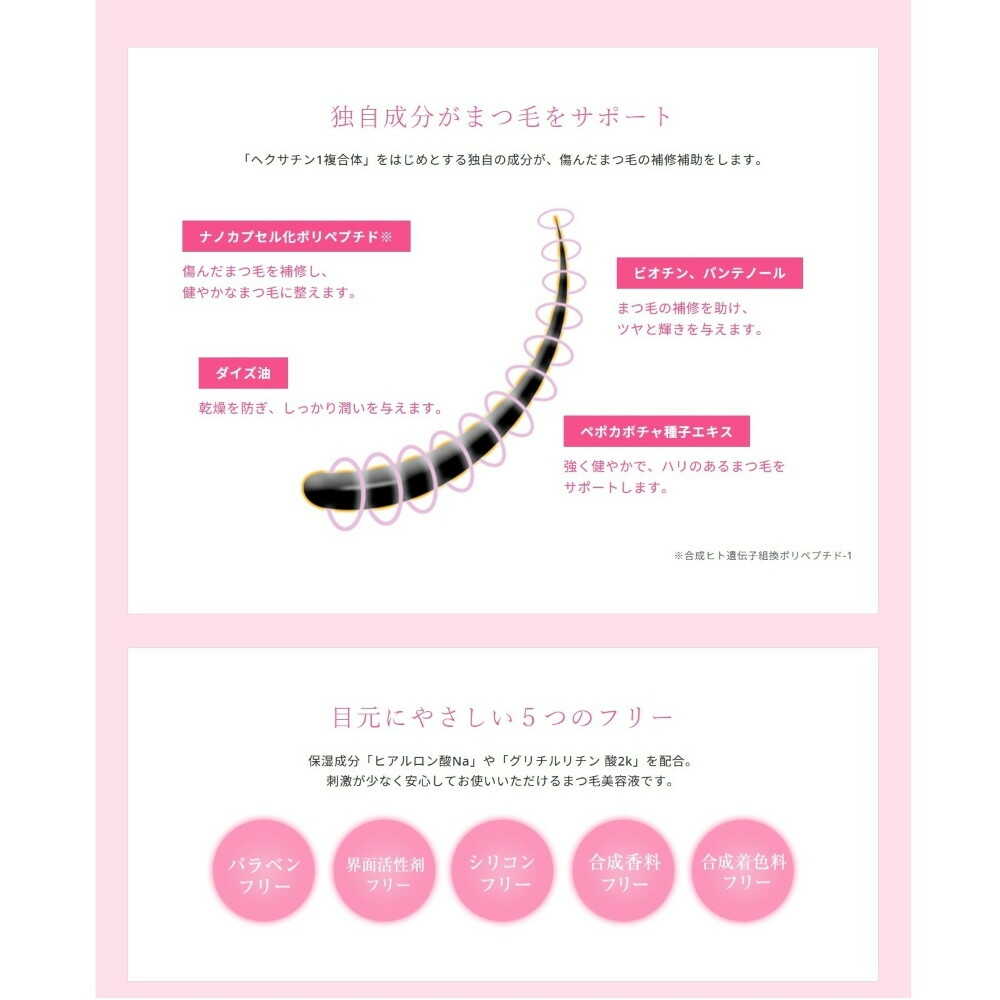 ハリと弾力に満ちたエクステ級の美まつ毛に かんたん1日1回 毎日、夜の洗顔後に上まつ毛の根元に、目頭から目尻に向けてスーッとアイライナーのように塗るだけ! とても簡単、手間いらずです。 まつ毛にハリ、コシ、ツヤ 薄い、少ない、まばらでボンヤリしたまつ毛に、傷んだまつ毛の補修補助成分「ヘクサチン1複合体」が、キリッと艶やかなコシを与えます。 こんなまつ毛でお悩みの方に ●まつ毛のハリ・コシが気になる方 ●エクステ・まつ毛パーマなどのダメージが気になる方 ●まつ毛のお手入れに時間がかかる方 独自成分がまつ毛をサポート 「ヘクサチン1複合体」をはじめとする独自の成分が、傷んだまつ毛の補修補助をします。 ナノカプセル化ポリペプチド※:傷んだまつ毛を補修し、健やかなまつ毛に整えます。※合成ヒト遺伝子組換ポリペプチド-1 ダイズ油:乾燥を防ぎ、しっかり潤いを与えます。 ビオチン、パンテノール:まつ毛の補修を助け、ツヤと輝きを与えます。 ペポカボチャ種子エキス:健やかで、ハリのあるまつ毛をサポートします。 目元にやさしい5つのフリー パラベン・界面活性剤・シリコン・合成香料・合成着色料フリー