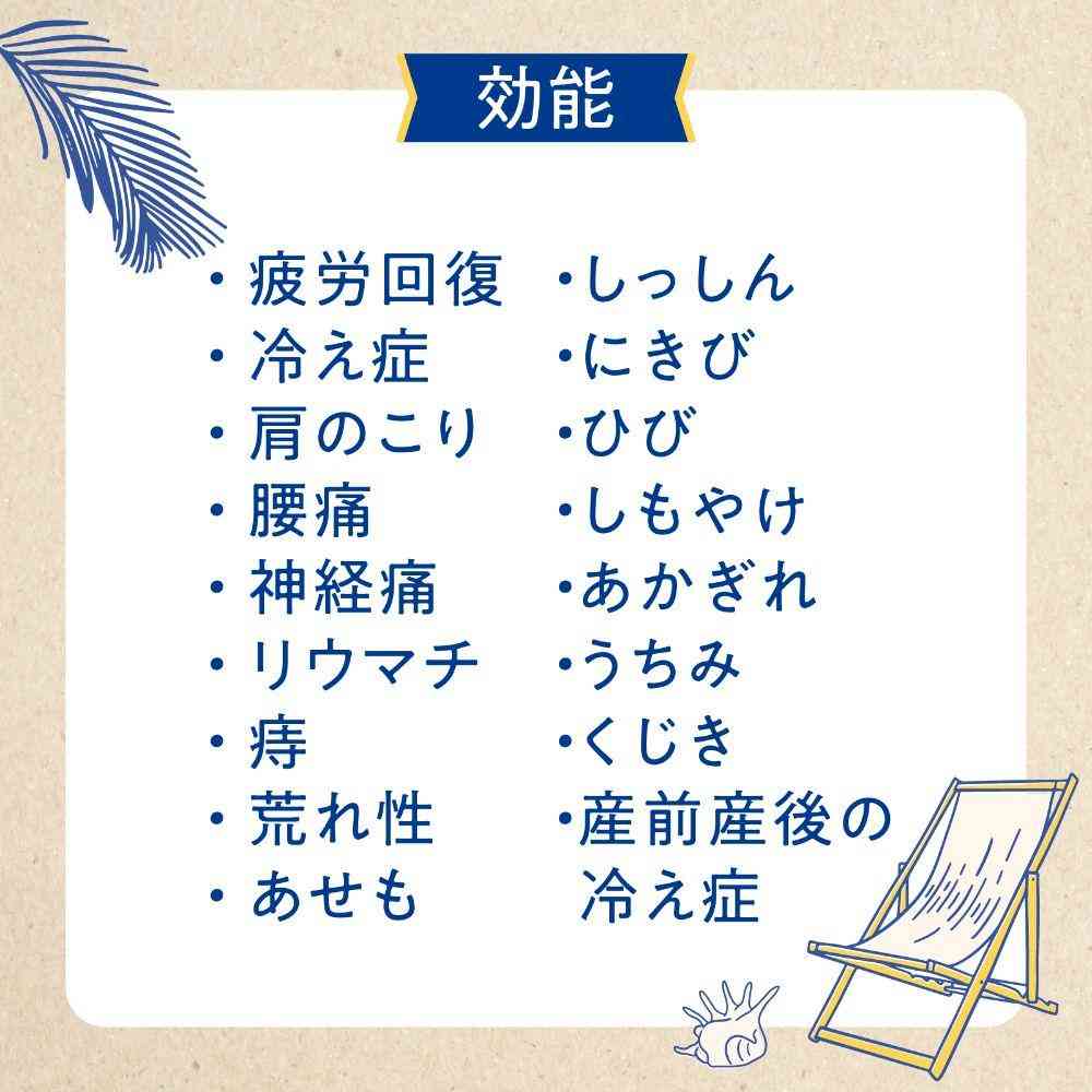 疲労回復、冷え症、肩のこり、腰痛、神経痛、リウマチ、痔、荒れ性、あせも、しっしん、にきび、ひび、しもやけ、あかぎれ、うちみ、くじき、産前産後の冷え症