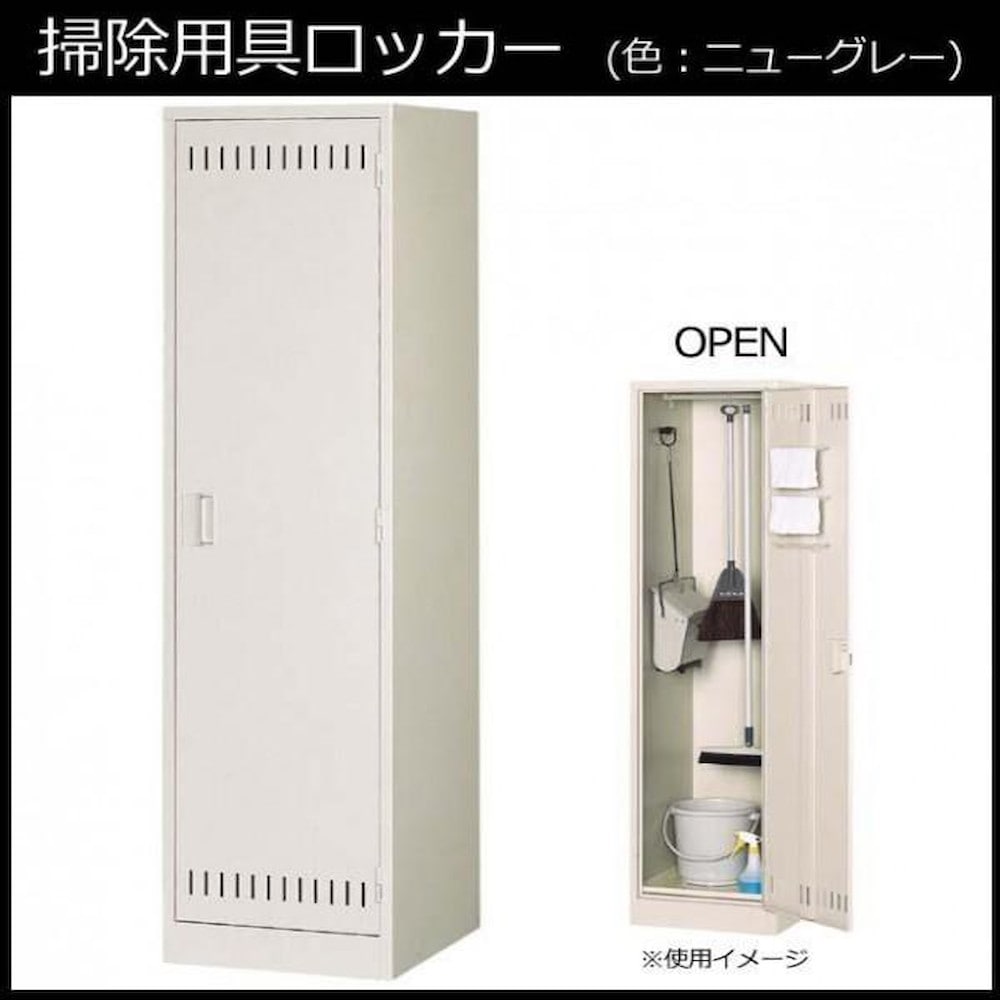 オフィスや店舗に☆シンプルで使いやすいロッカー。ほうきやモップなど背の高い掃除用具から雑巾・洗剤・バケツなどの小物類まで、掃除用具の収納に最適なロッカーです。インテリアに馴染みやすいカラー(ニューグレー)は、オフィスや店舗などへの設置にピッタリ!【耐荷重】全体耐荷重:90kg、天板:40kg、ハンガーパイプ:18kg、地板:40kg、※各部品の耐荷重が、全体耐荷重を超えないようにご使用ください。